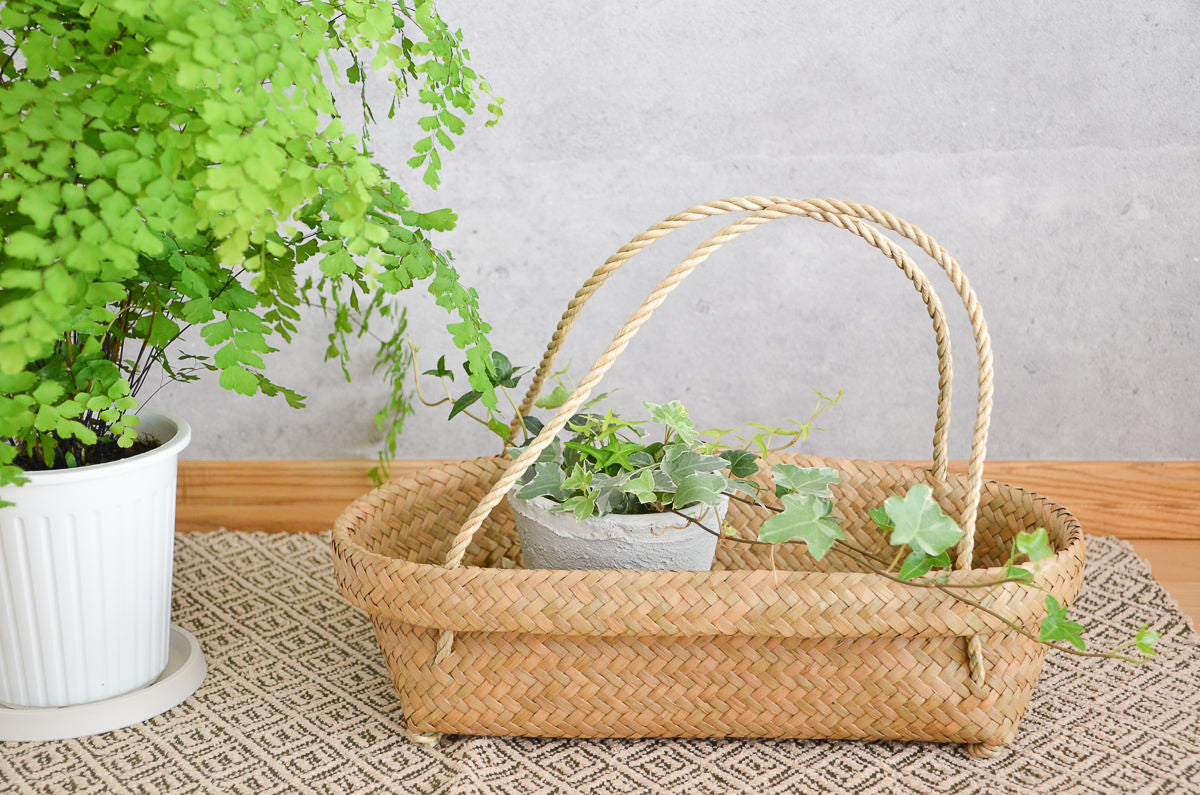 届いたかごはとても軽く、手触りはなめらかで、触っていると気持ちが良いです。また、しっかりした持ち手も安心感があり、付け根の止め方がリボンのようで可愛らしいです。
