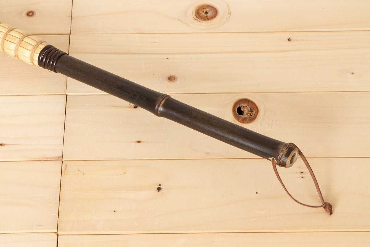 基本の姿勢は片手で柄を持ち、床に対して垂直に穂先をあてる。
