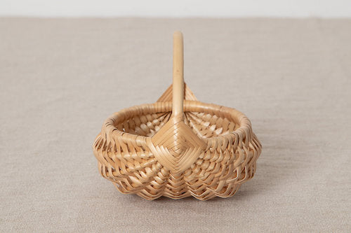 やなぎには樹皮がついていますが、その表面の皮をとり、調えた状態の「むきやなぎ」を使って編まれたかごをご紹介します。