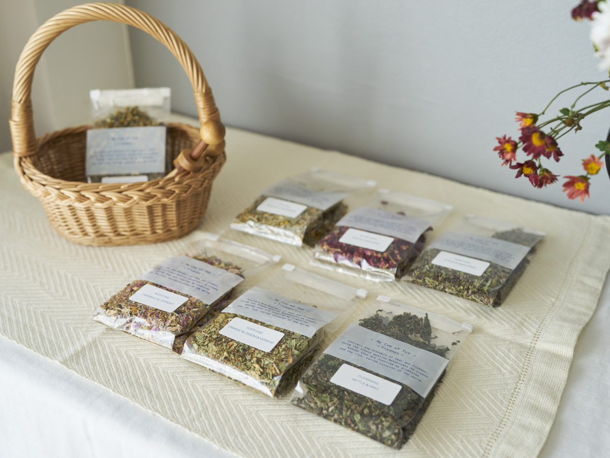 お気に入りのお菓子やお茶でつかう道具などをこちらのかごに。