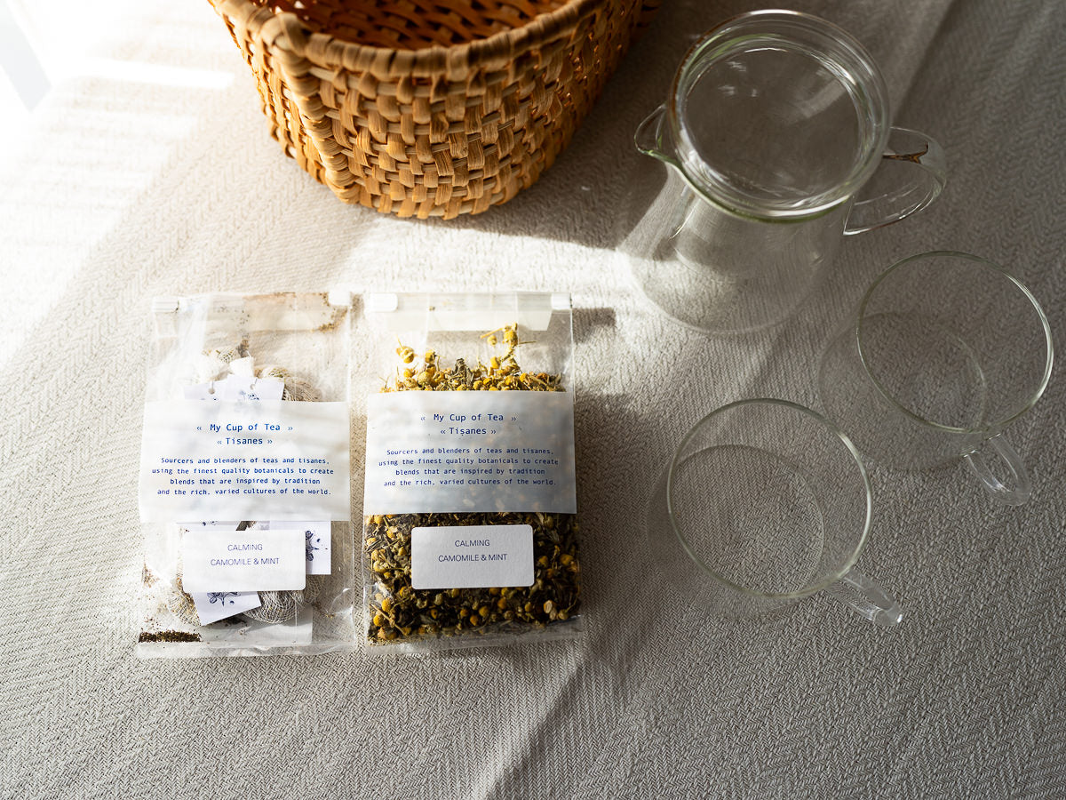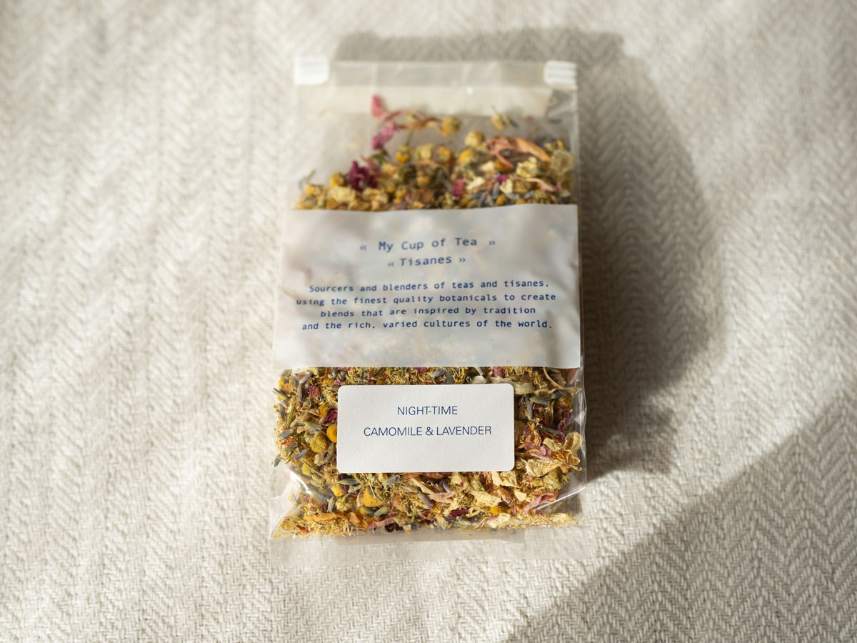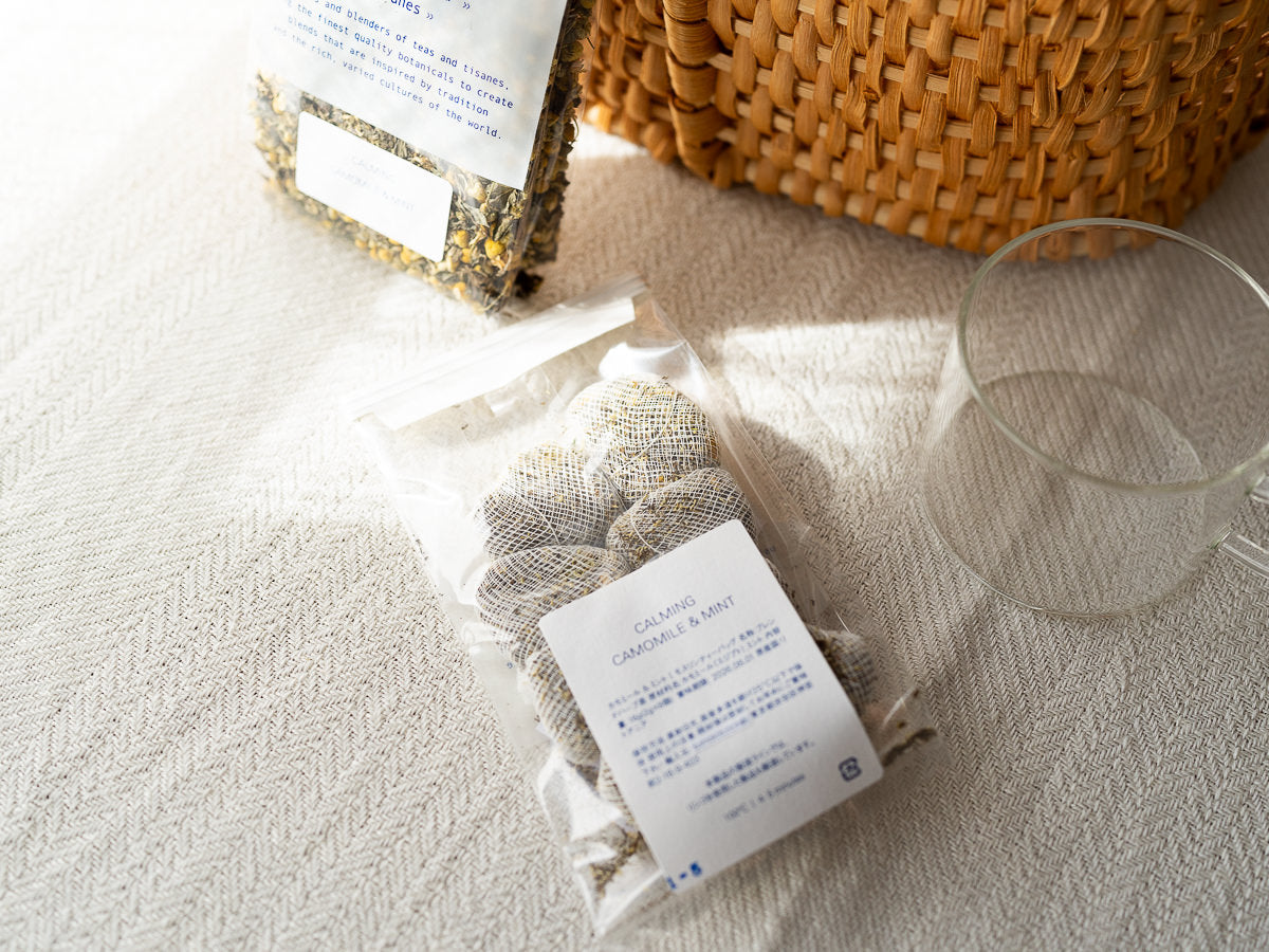 就寝前の一杯としておすすめのカモミールとラベンダーのティザンヌブレンド。ジャスミンや芍薬の花などを合わせ、華やかでやさしい味わいに仕上げました。豊かな香りと自然な甘みが、心を落ち着かせ安眠を誘います。