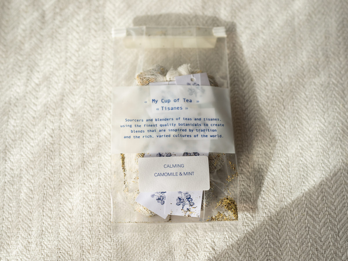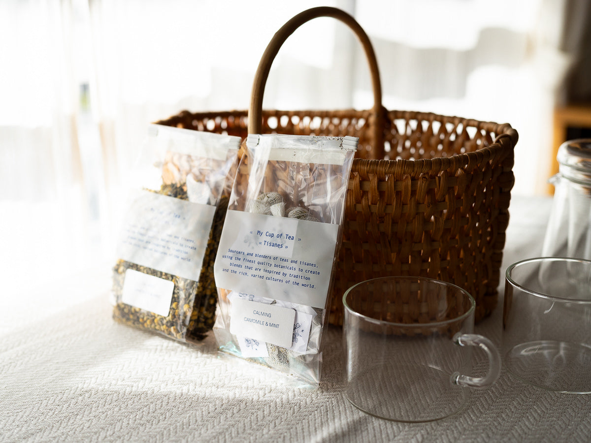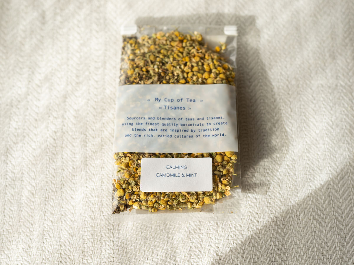 就寝前の一杯としておすすめのカモミールとラベンダーのティザンヌブレンド。ジャスミンや芍薬の花などを合わせ、華やかでやさしい味わいに仕上げました。豊かな香りと自然な甘みが、心を落ち着かせ安眠を誘います。