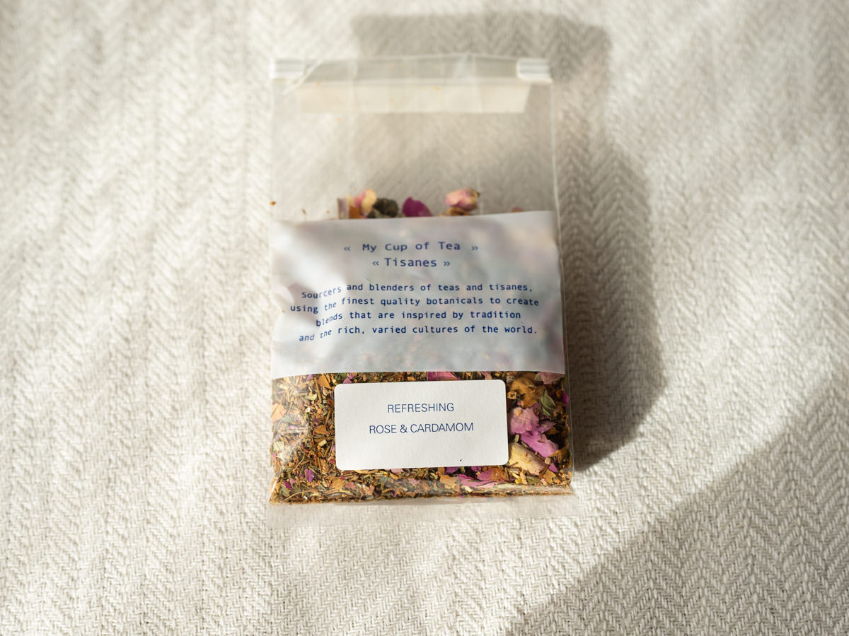 心を鎮めてくれるダマスクローズとカルダモンのティザンヌブレンド。ローズの花はひとつひとつ手でほぐし、甘みが出やすい部分を使用。ローズの華やかな香りと、ベルガモットやミント、グリーンルイボスの清涼感のある味わいが特徴です。