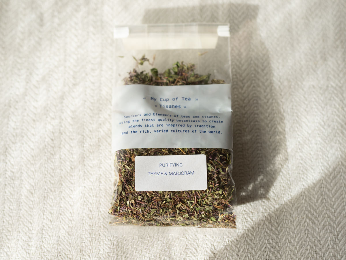 マジョラムとタイム、ペパーミントの力強い香りで、気分をリフレッシュさせてくれるティザンヌブレンド。瑞々しく爽快な香りと、すっきりとした味わいが特徴です。蒸気吸入器での使用も可能です。