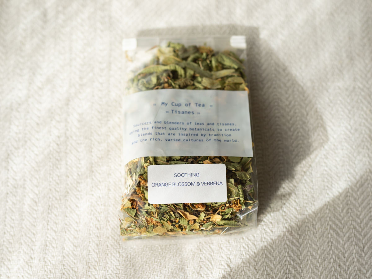 レモンバーベナに、リンデンとオレンジブロッサムを合わせた香り豊かなティザンヌブレンド。柑橘系のさわやかな香りと、自然な甘みが特徴です。熱湯で抽出した後、氷を入れたグラスに注いで冷やして飲んでいただくのもおすすめです。