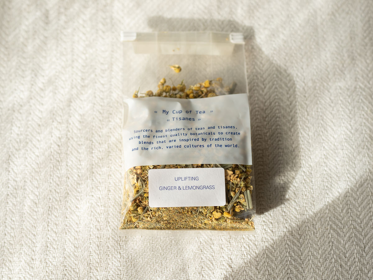 カモミールをベースに、ジンジャーとレモングラスを合わせたティザンヌブレンド。ジンジャーのスパイシーで清涼感のある味わいが特徴です。カモミールの甘みがありやさしい飲み心地のため、ハーブティーを飲み慣れていない方にもおすすめです。