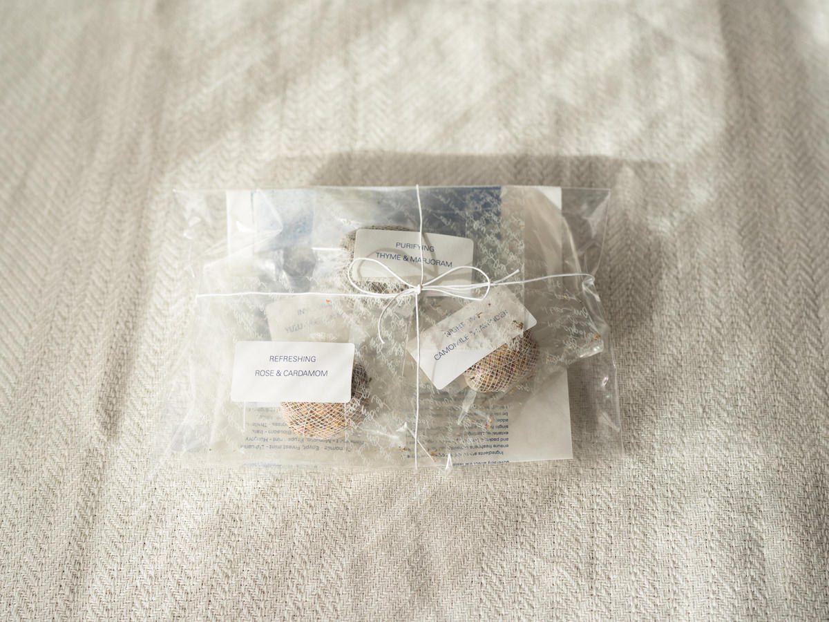 小さな布でハーブを手包みしてつくる“モスリンティーバッグ”は、