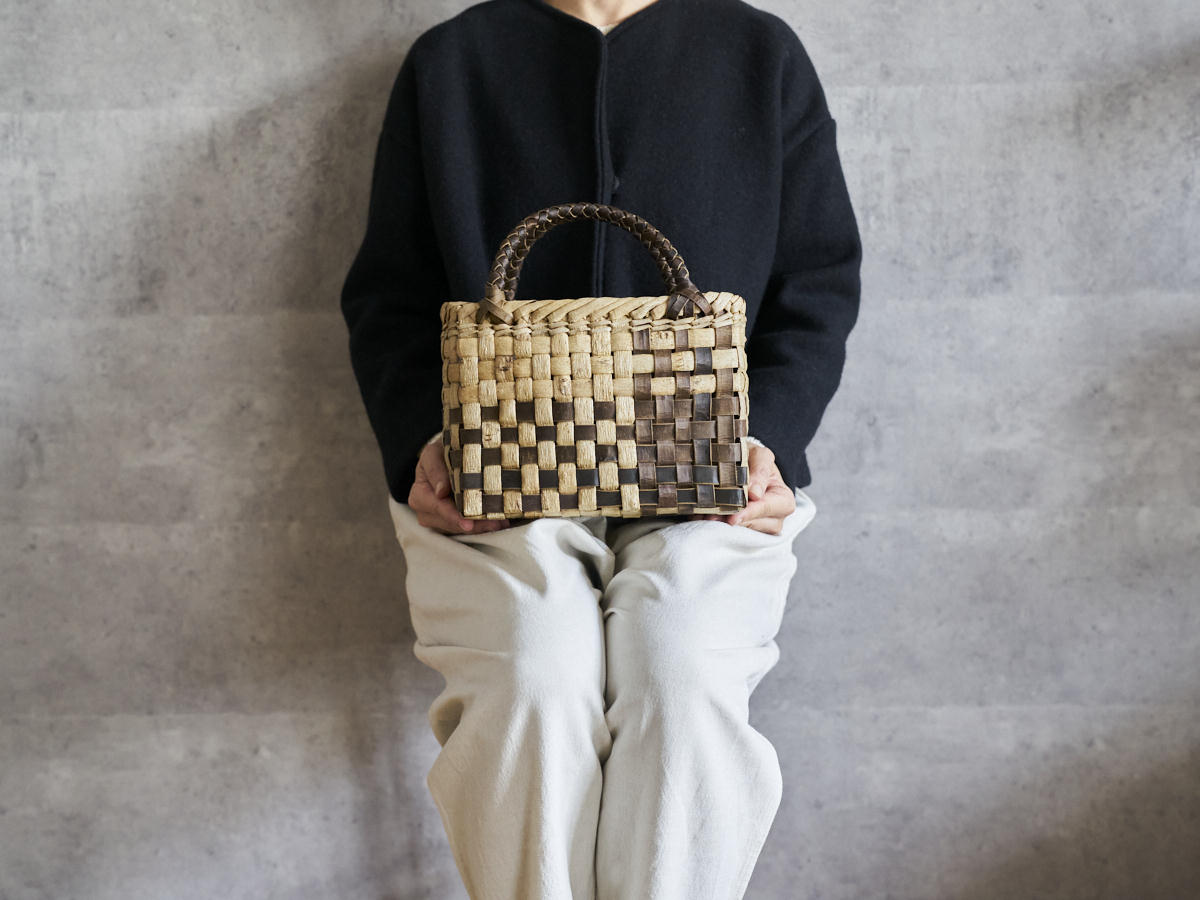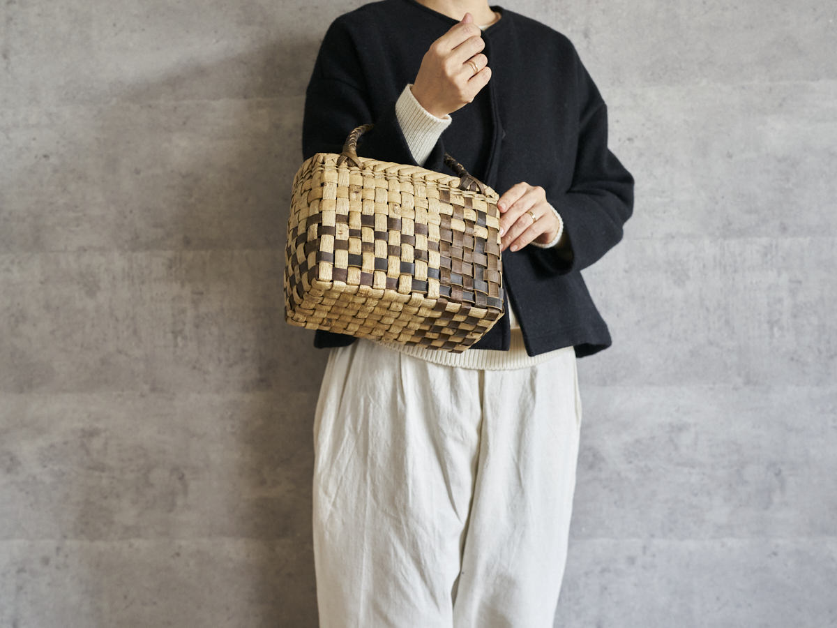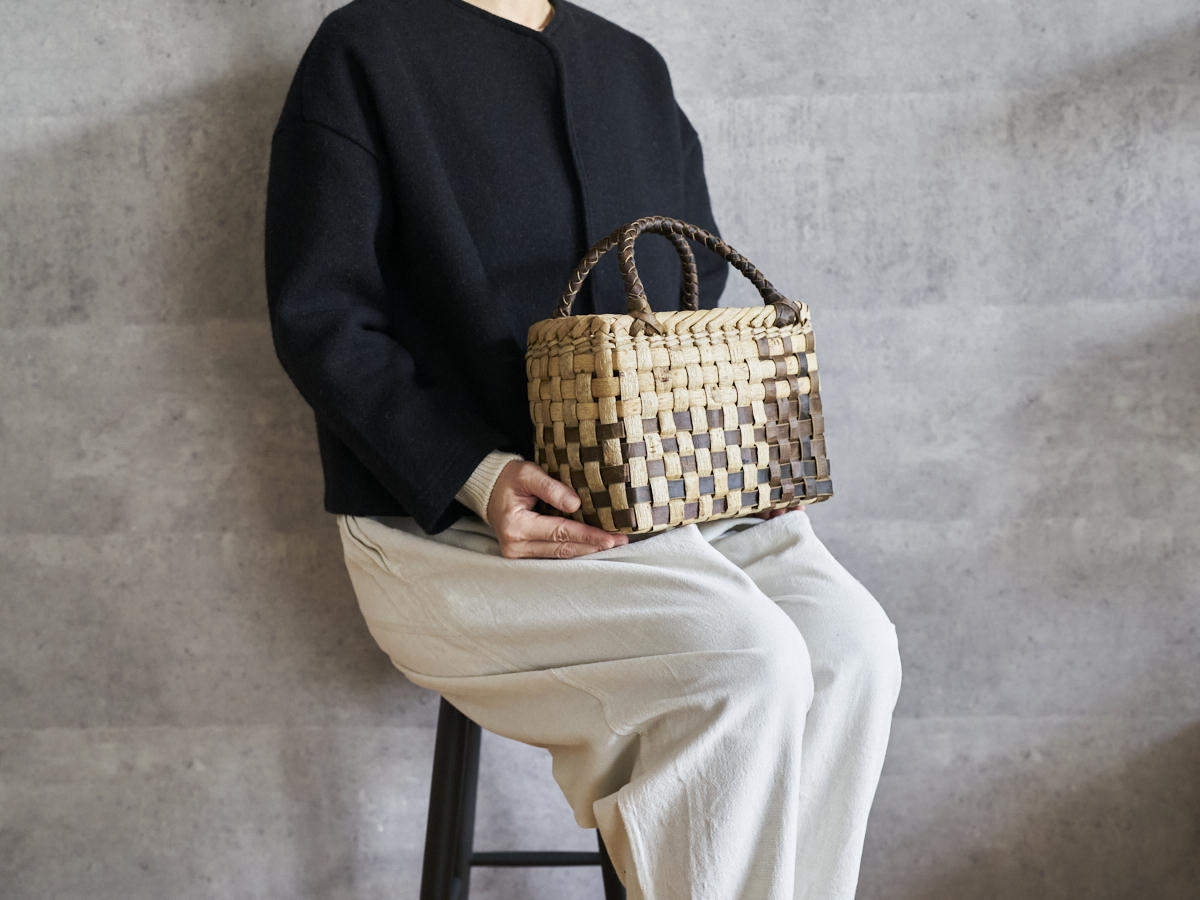 表皮と裏皮のコントラストのたのしさが光るかごバッグです。