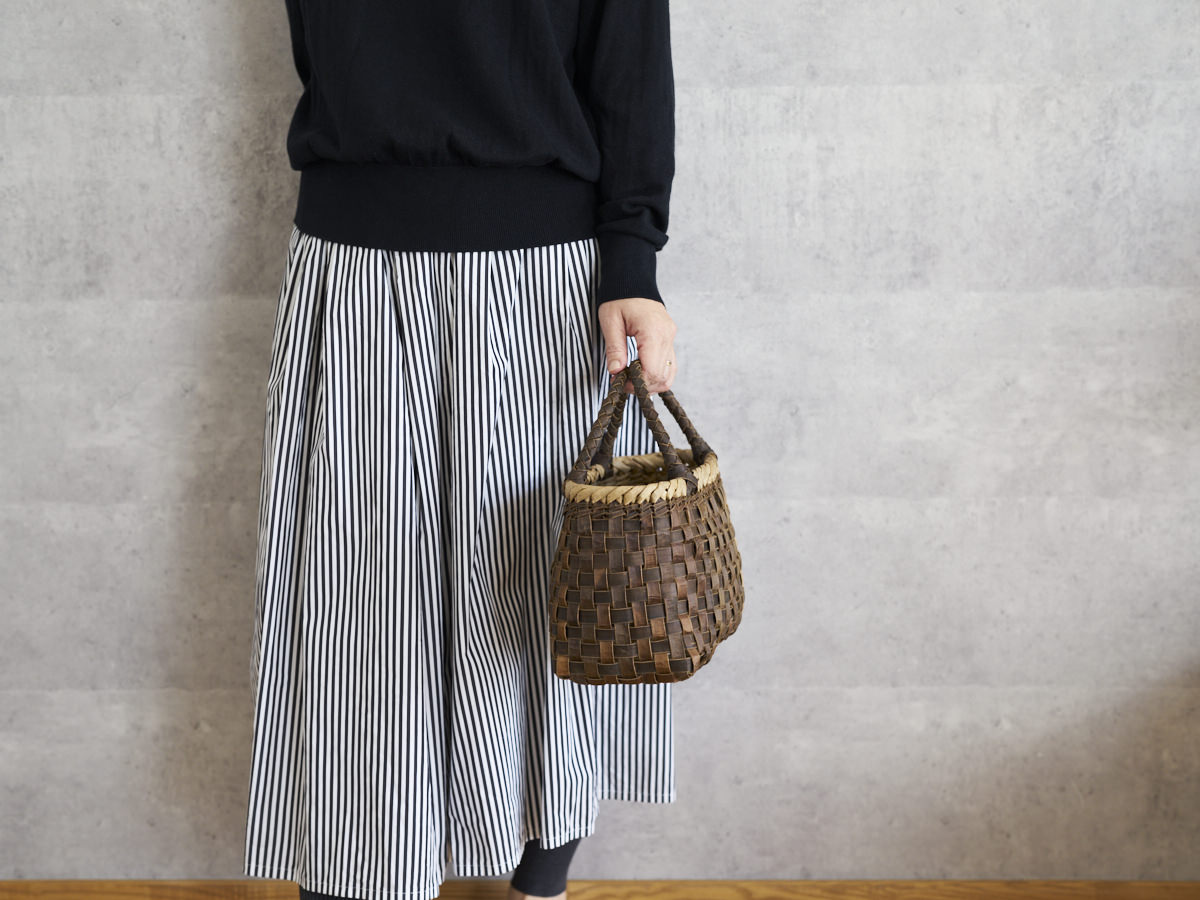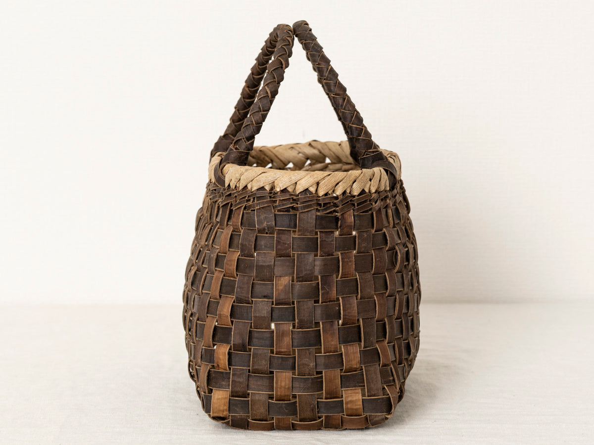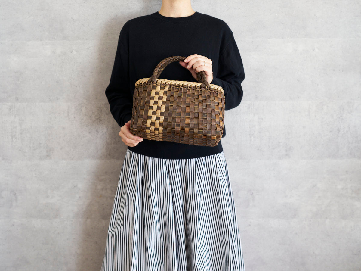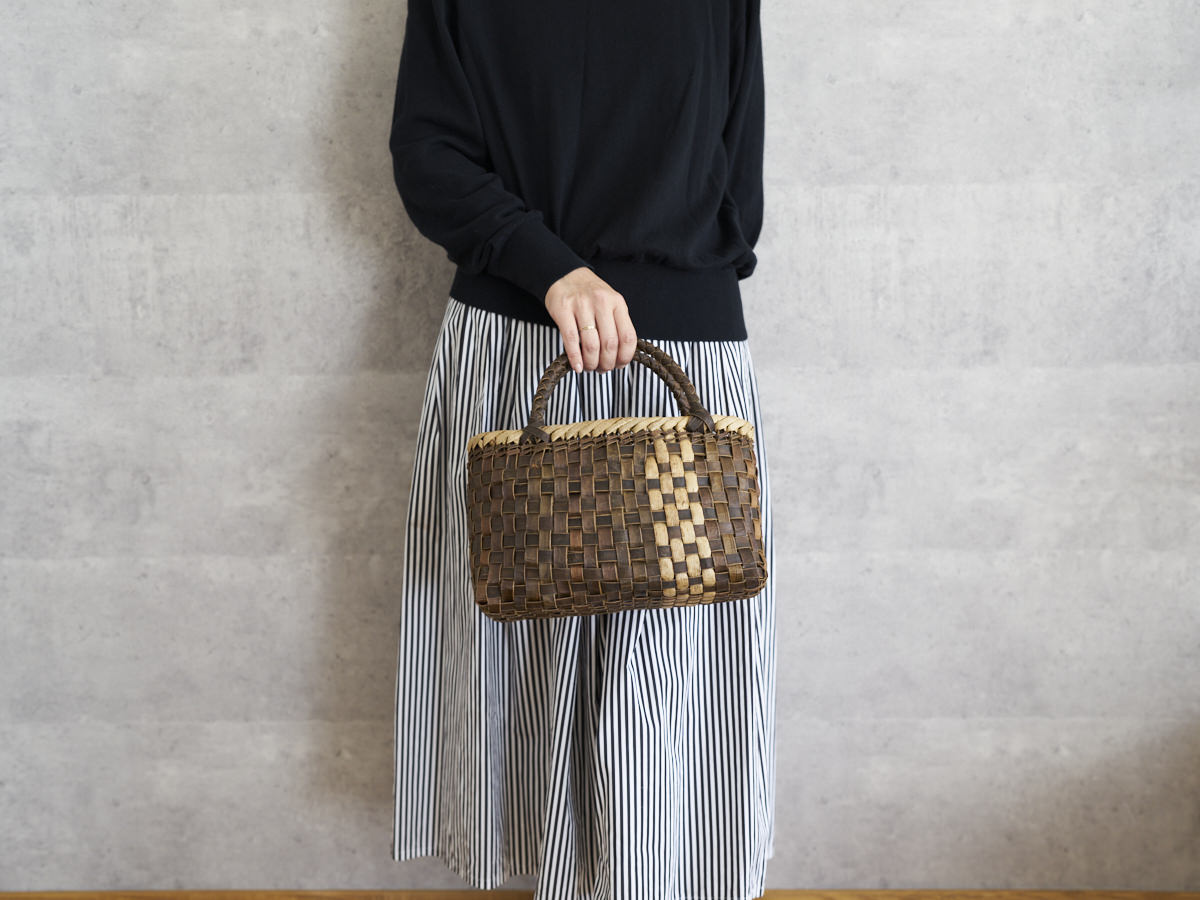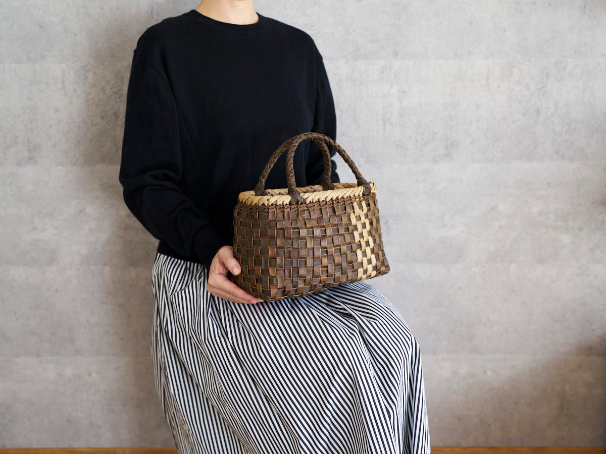 小ぶりでふっくらとしたフォルム、そして、こげ茶色の裏皮がメインにつかわれた、おちついた風合いのかごバッグです。