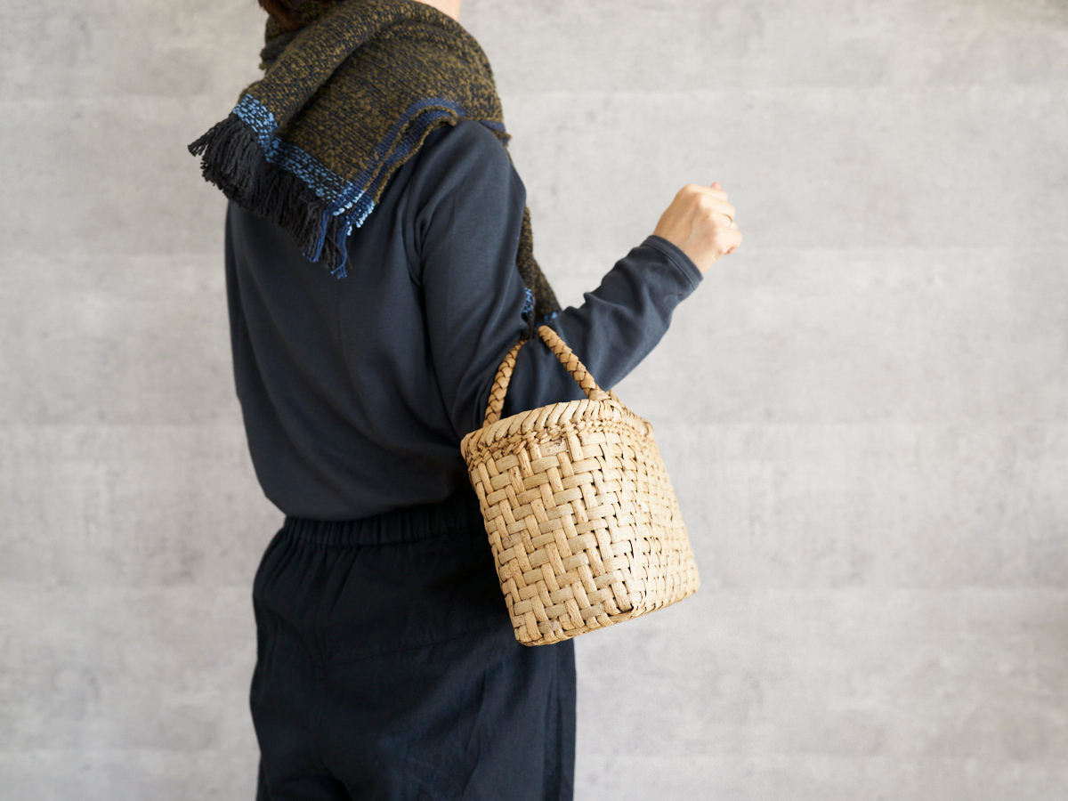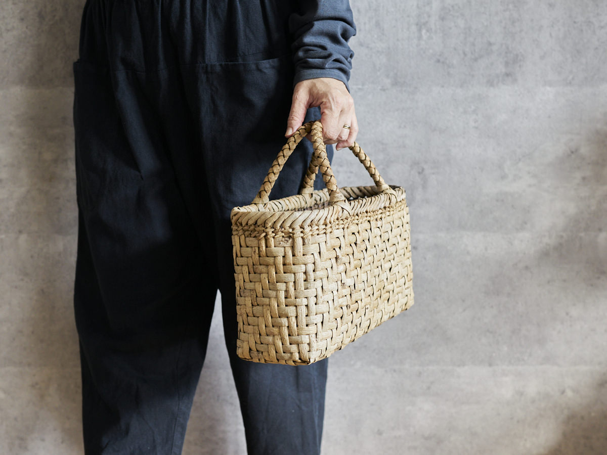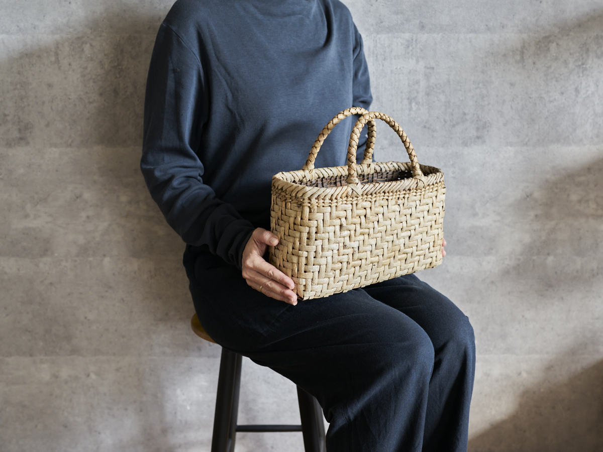 淡い色味で明るさをはなつ表皮をつかい、こまやかなあじろ編みが施されたかごバッグです。