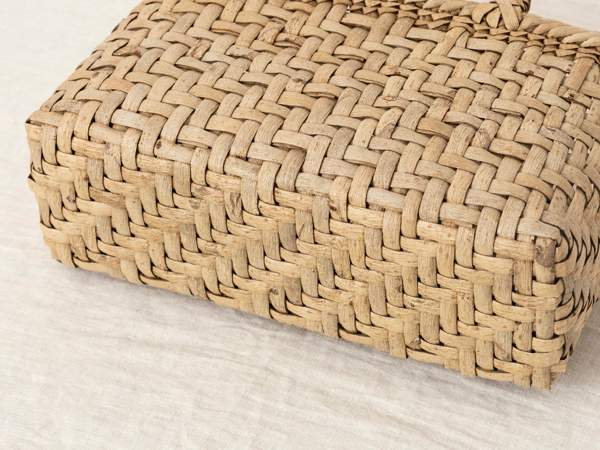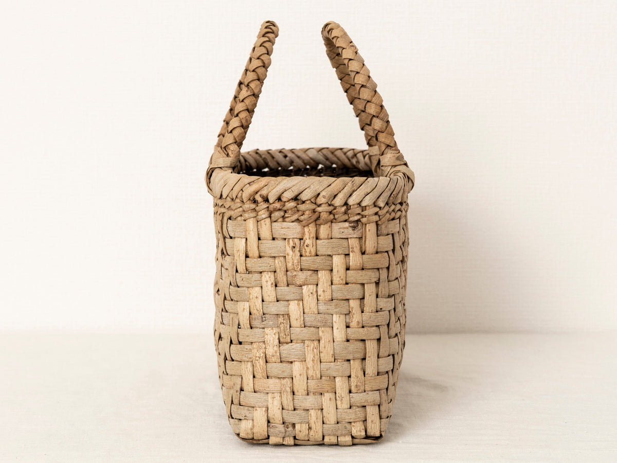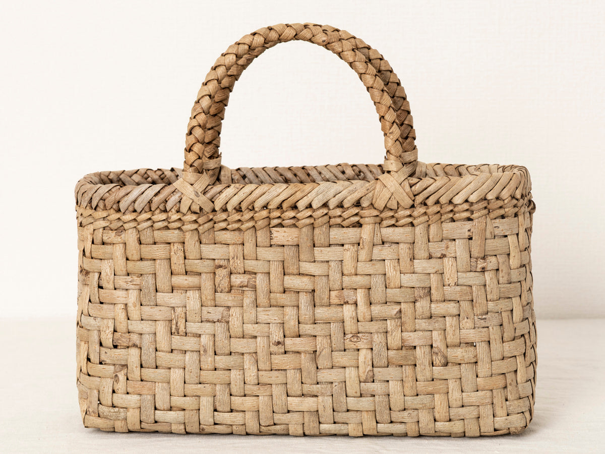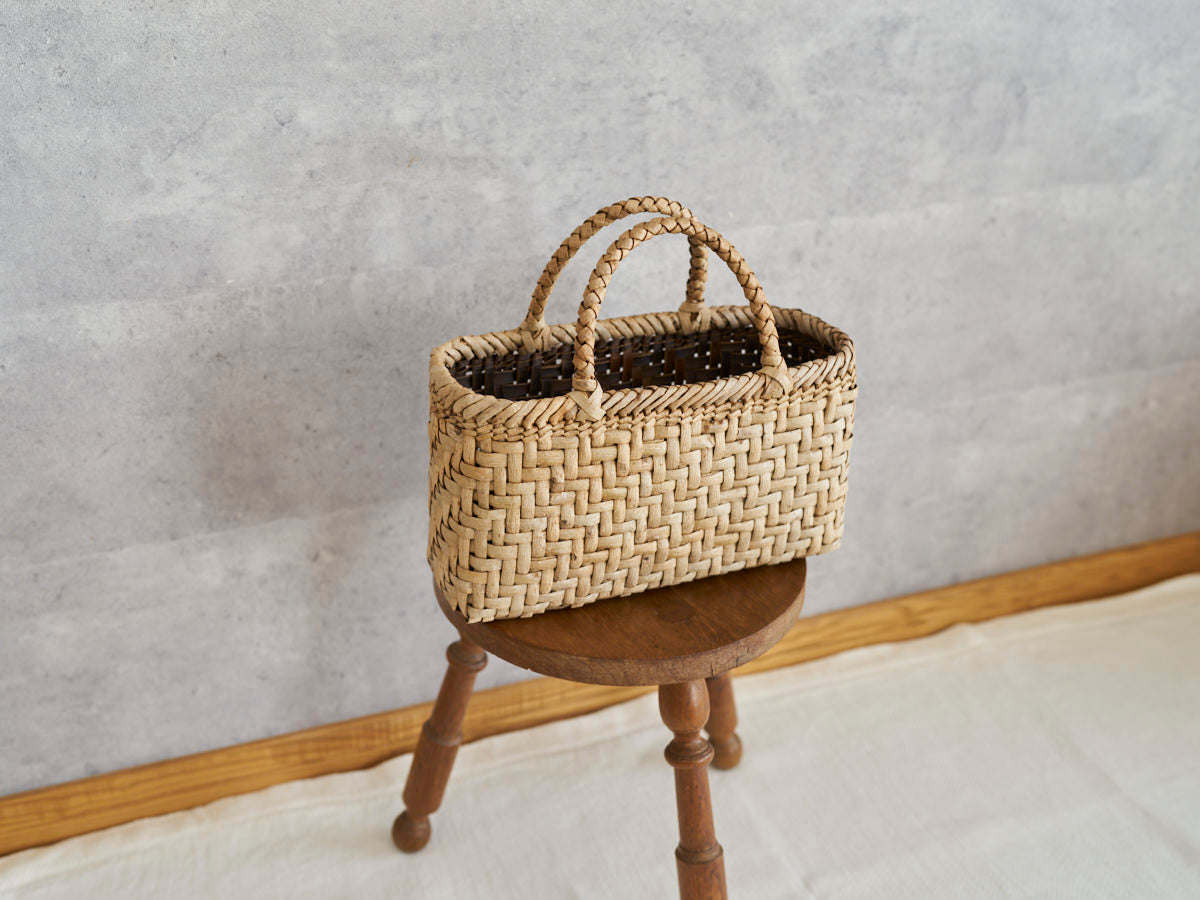 淡い色味で明るさをはなつ表皮をつかい、こまやかなあじろ編みが施されたかごバッグです。