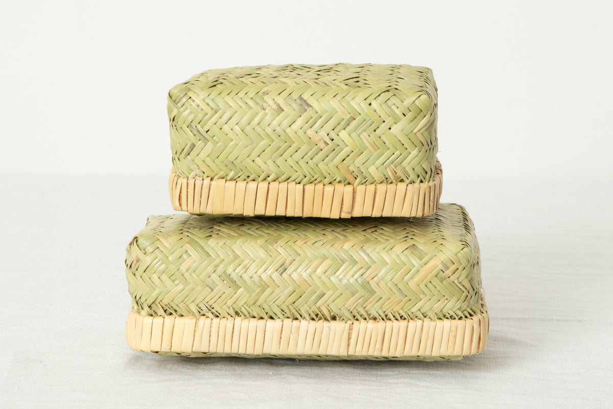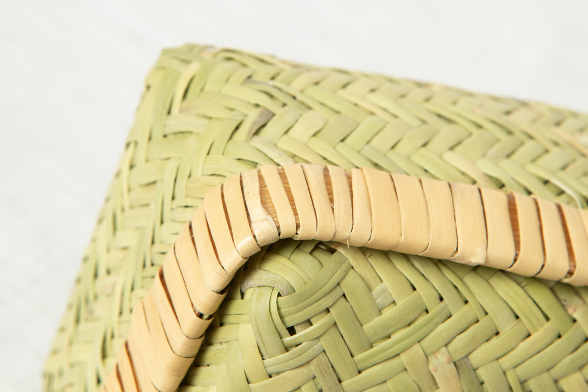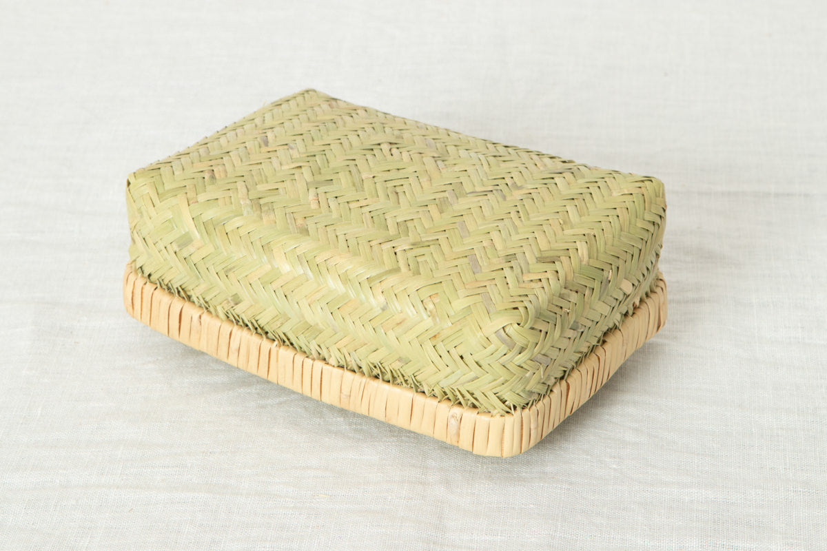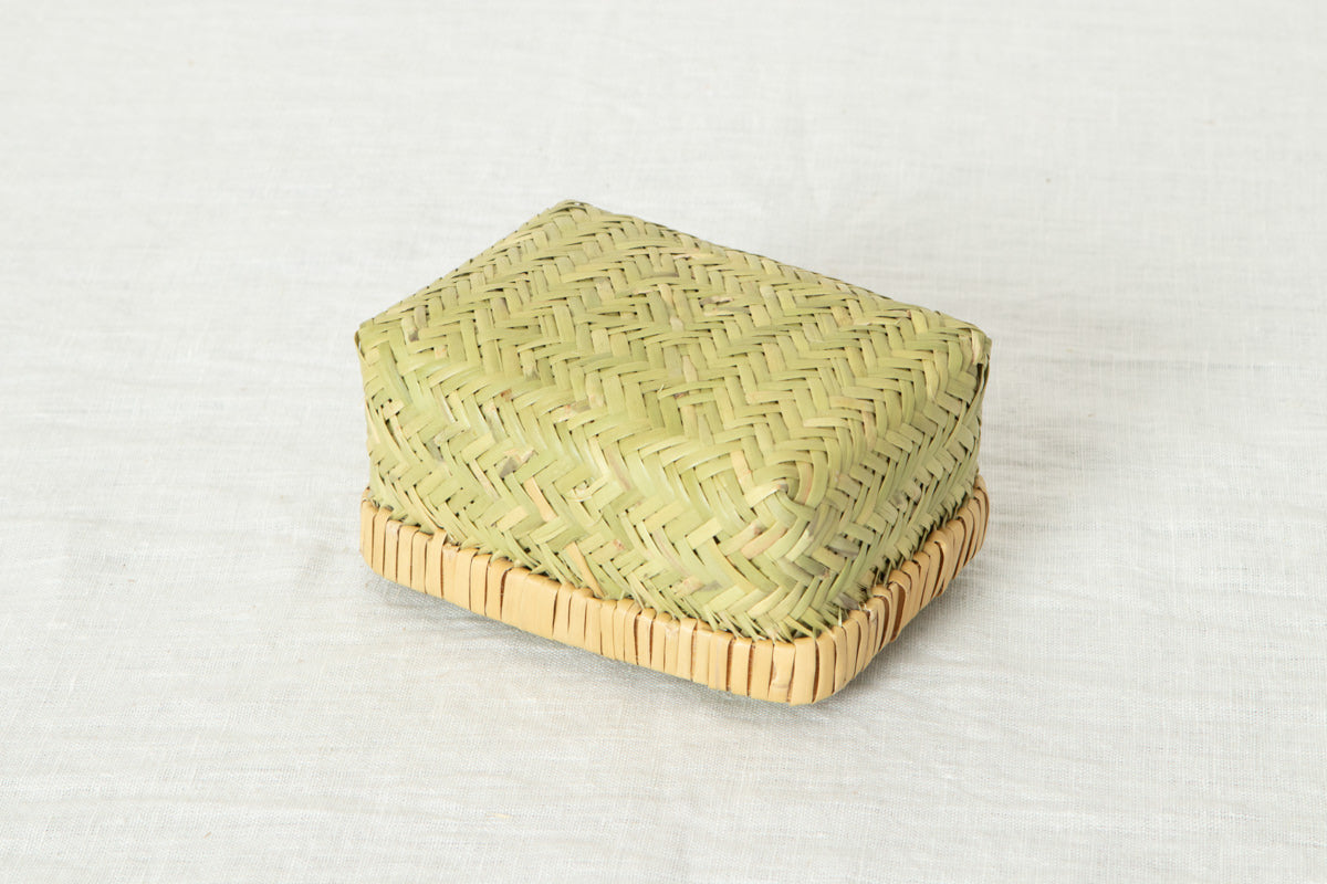 伝統的な「あじろ編み」という編み方で作られたこの地域の蓋付きかご、