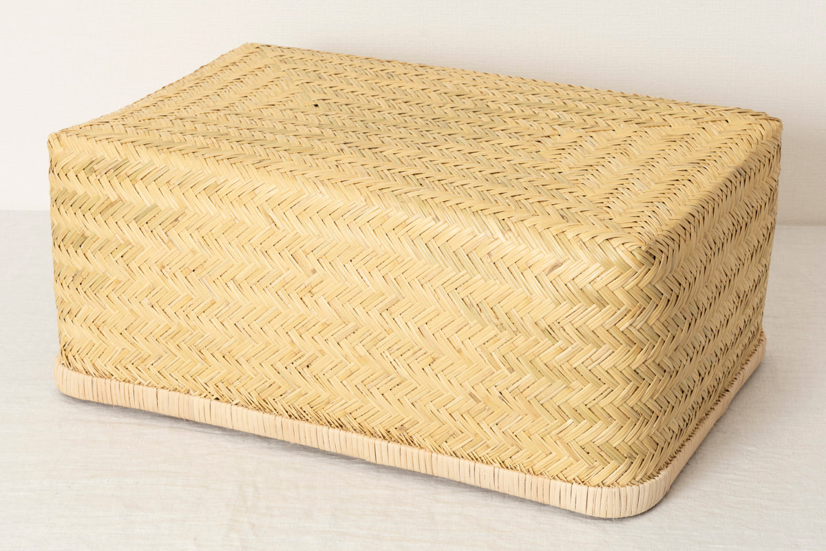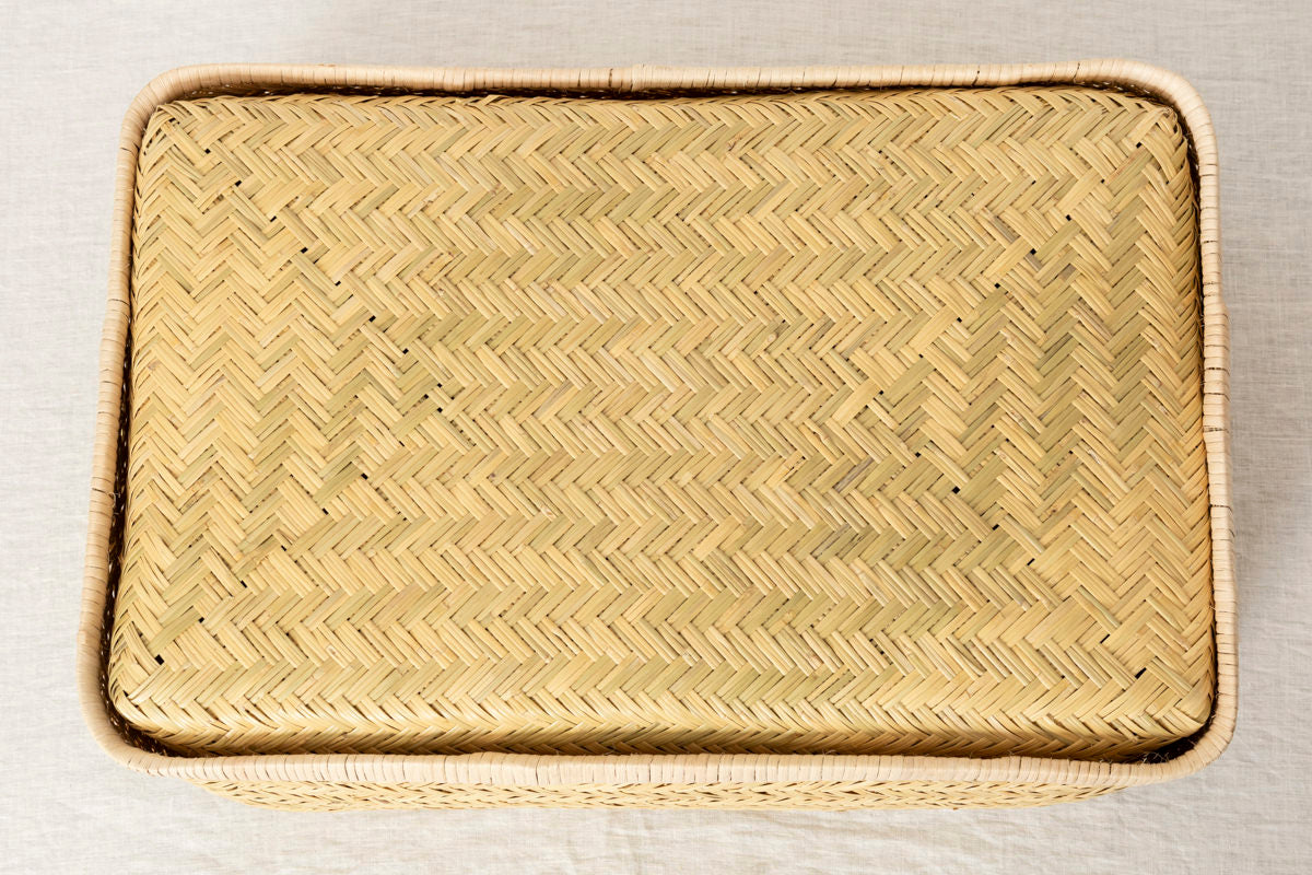 「あじろ編み」という伝統的な編み方で作られた、ふたつきかご。