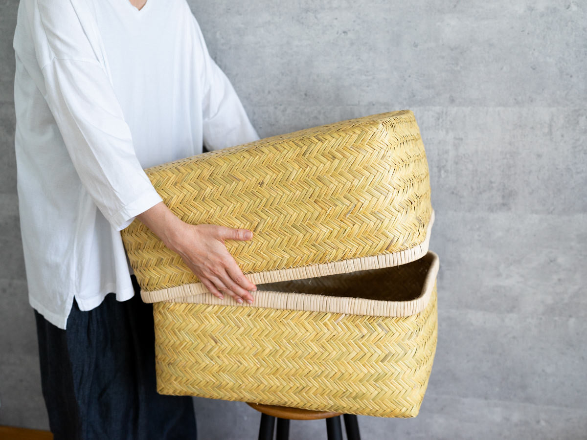 こちらの竹行李の特徴は、とにかくその大きさの割にとても軽いということ。そして、しなやかで丈夫なため、丁寧に扱えば世代を越えて長く使いつづけることができます。