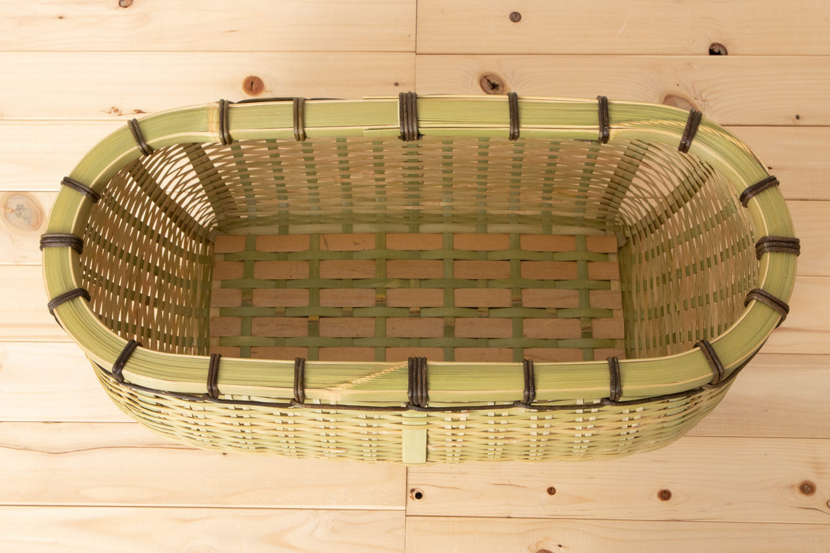 こちらの籠は青竹の表皮を薄く削いだ(「みがき」と言います)竹ひごで編まれています。