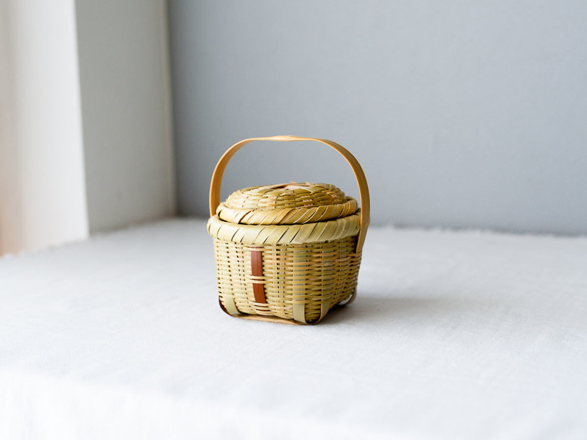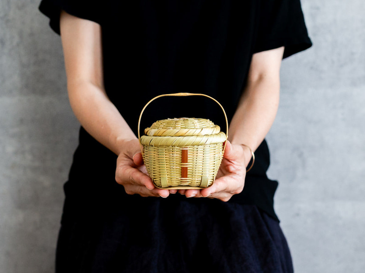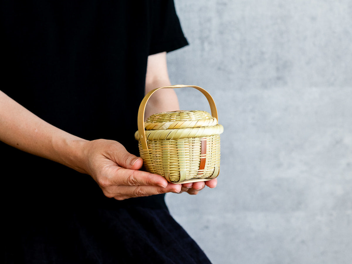 こちらは「青竹-あおたけ-」に“みがき”をかけたひごで、編まれた蓋付きのバスケットです。