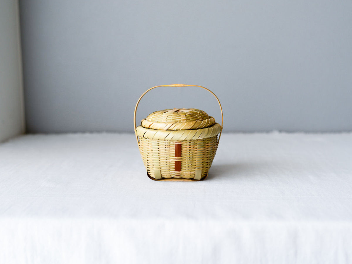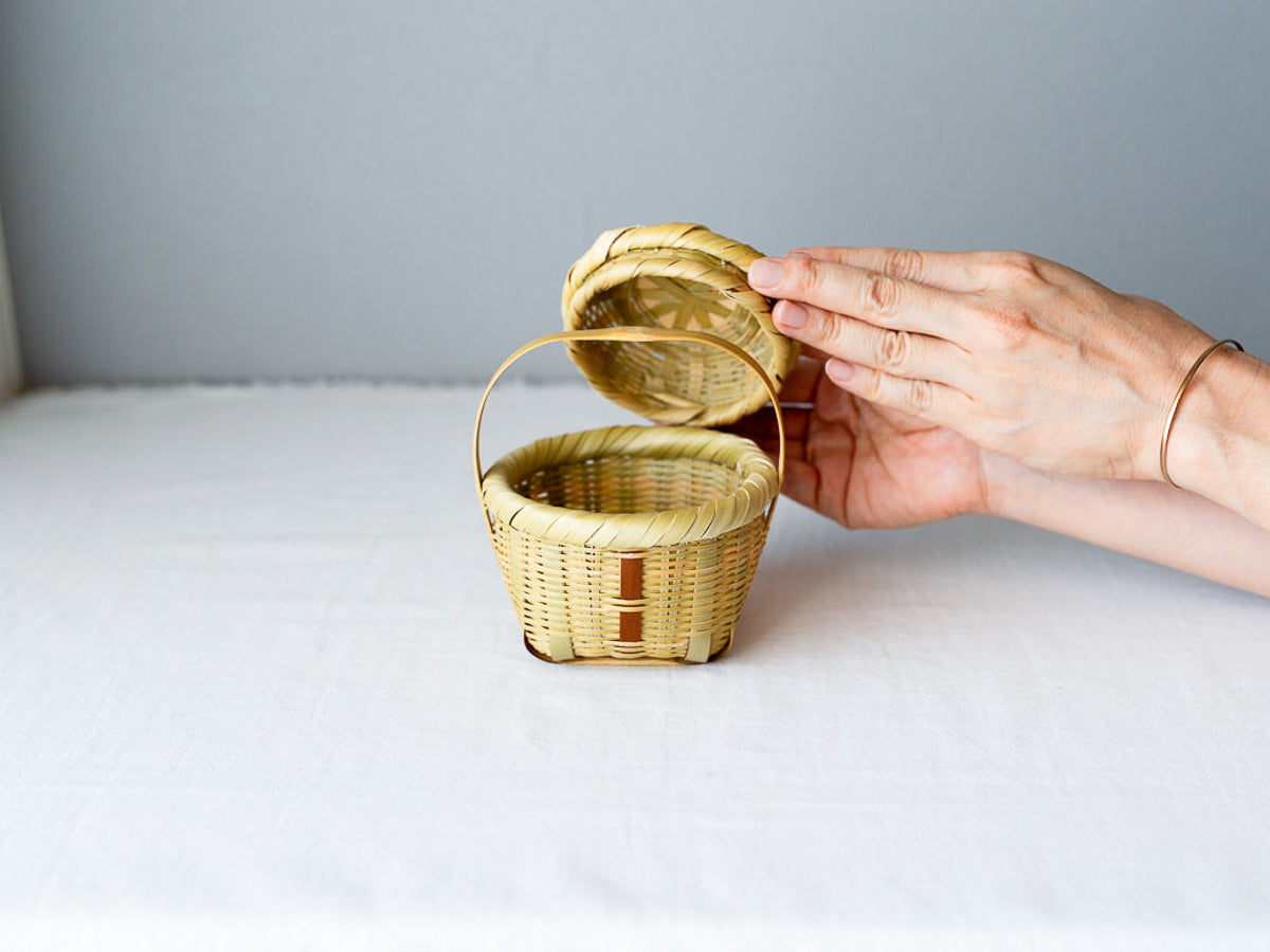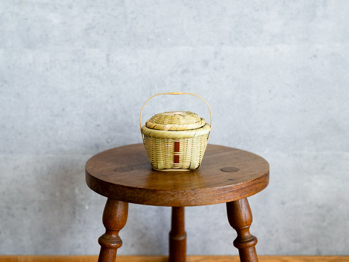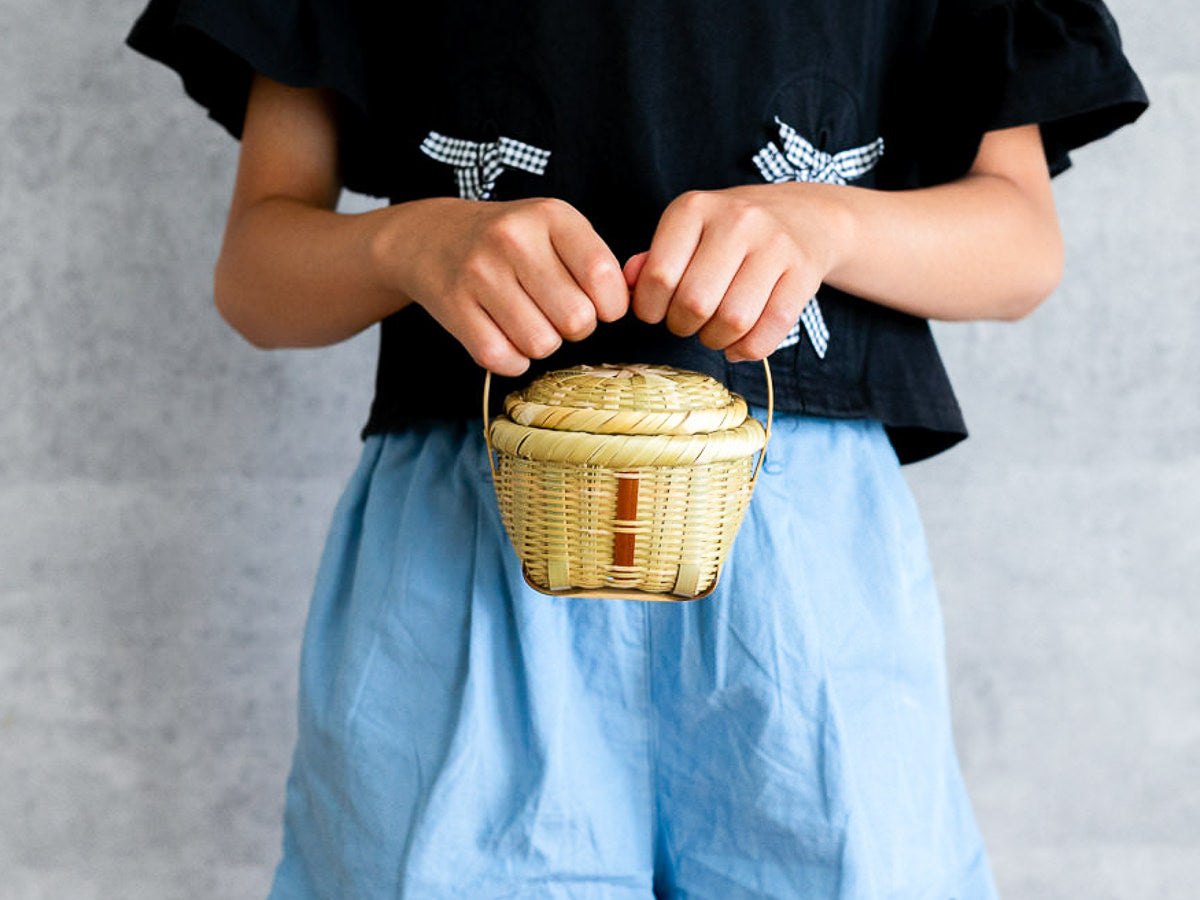 こちらは「青竹-あおたけ-」に“みがき”をかけたひごで、編まれた蓋付きのバスケットです。