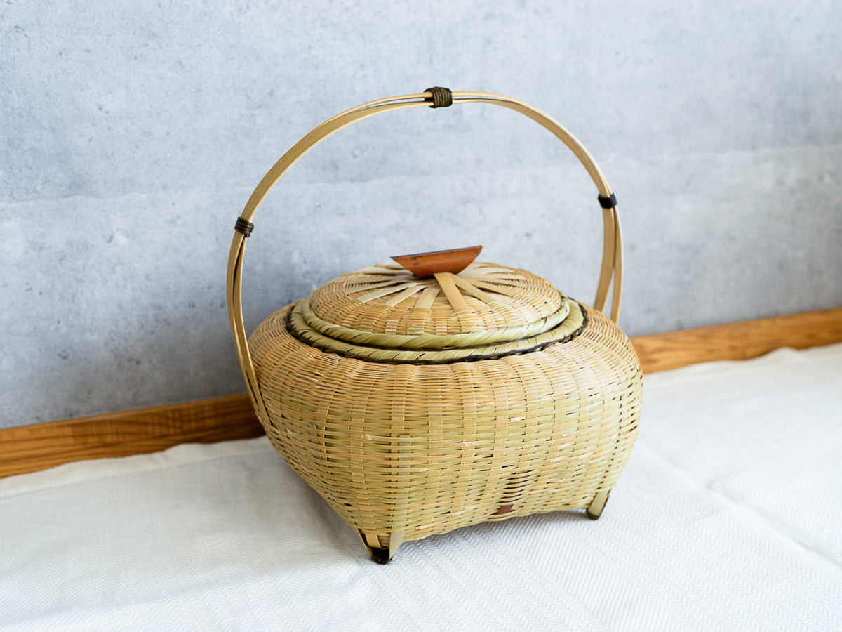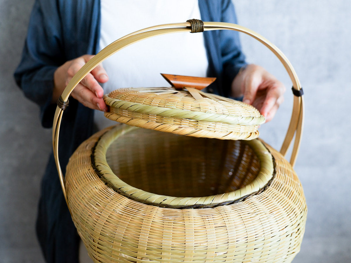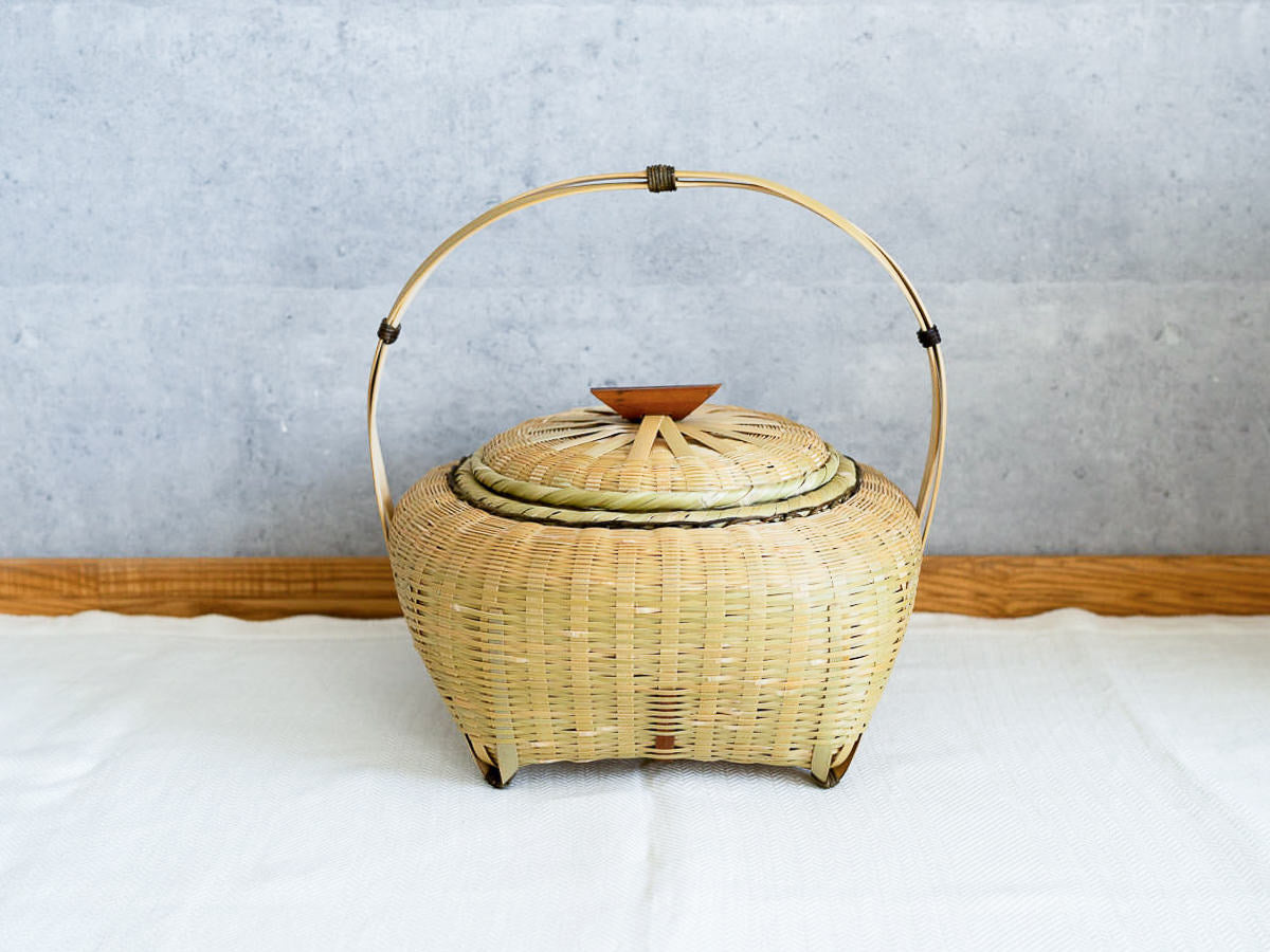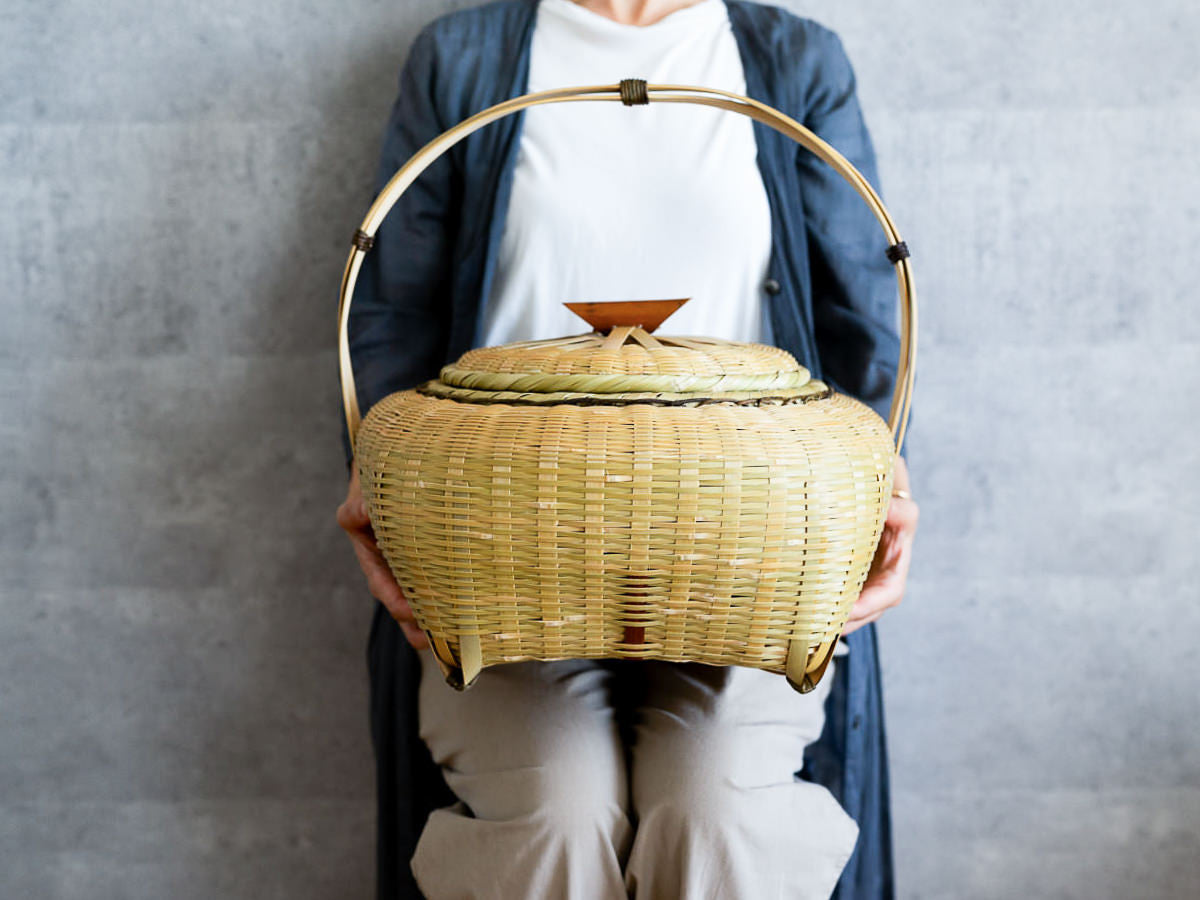 こちらは「青竹-あおたけ-」に“みがき”をかけたひごで、編まれた蓋付きのバスケットです。