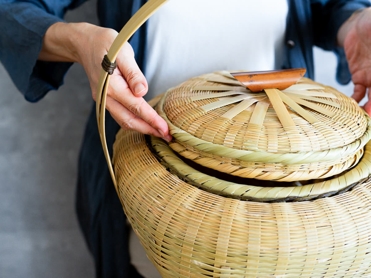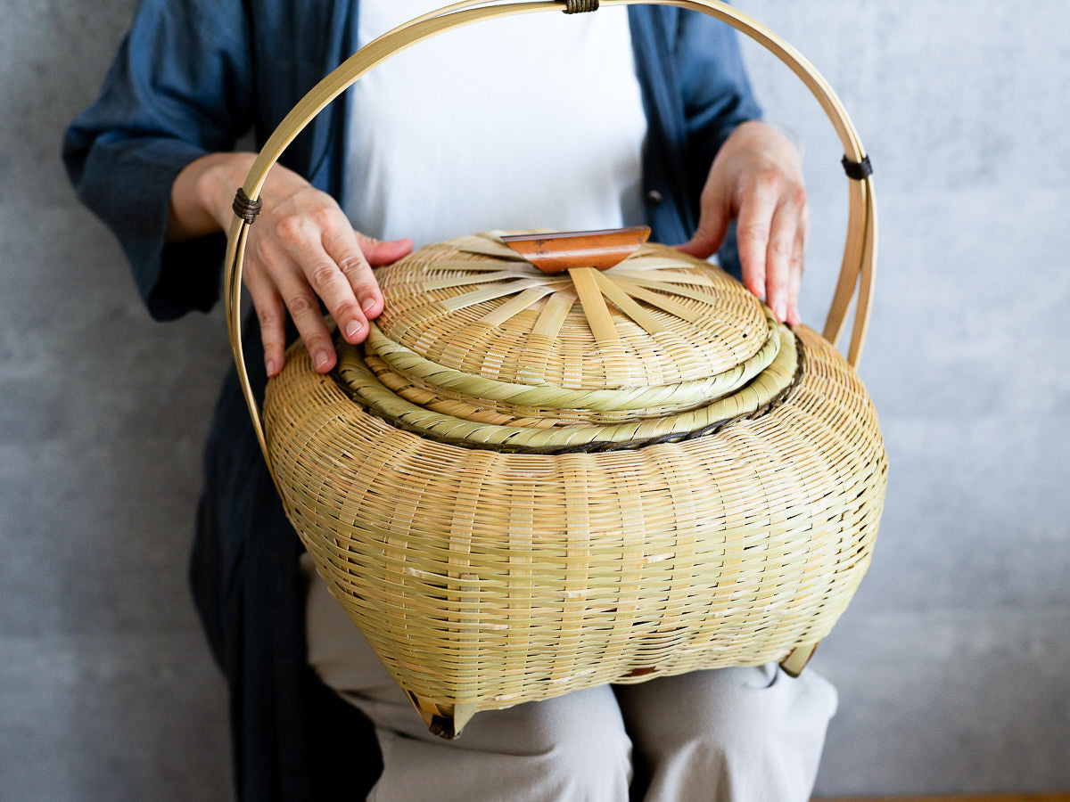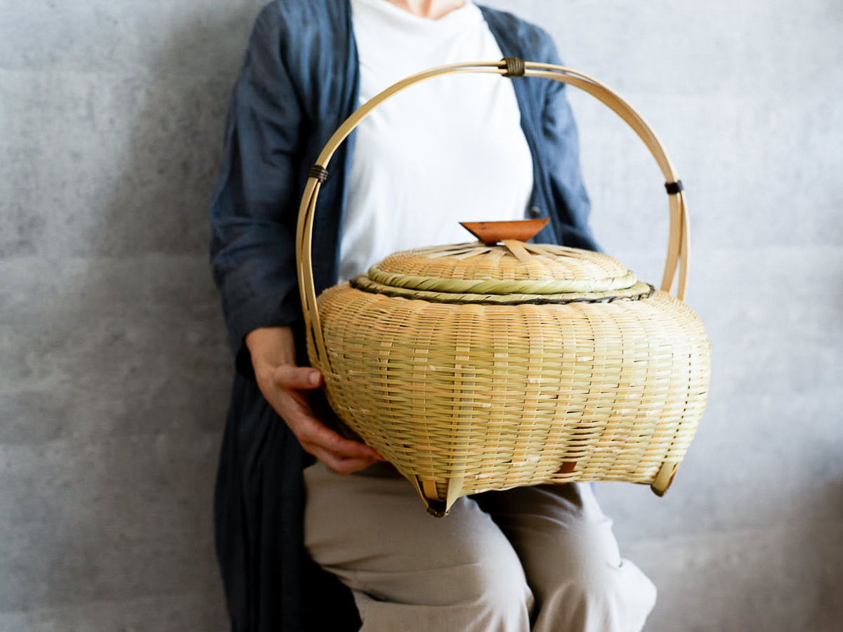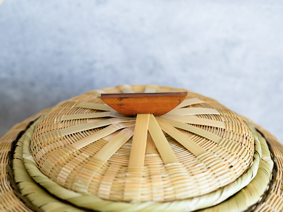 こちらは「青竹-あおたけ-」に“みがき”をかけたひごで、編まれた蓋付きのバスケットです。