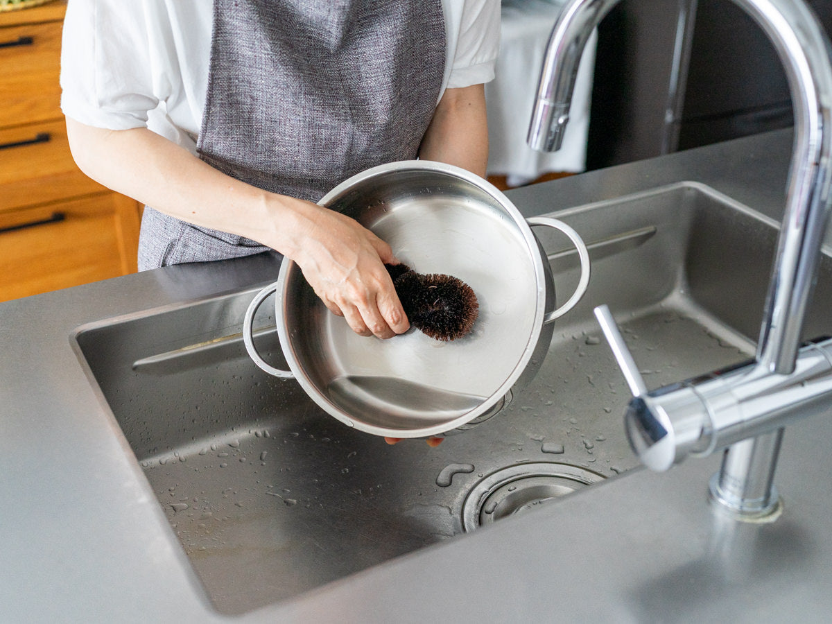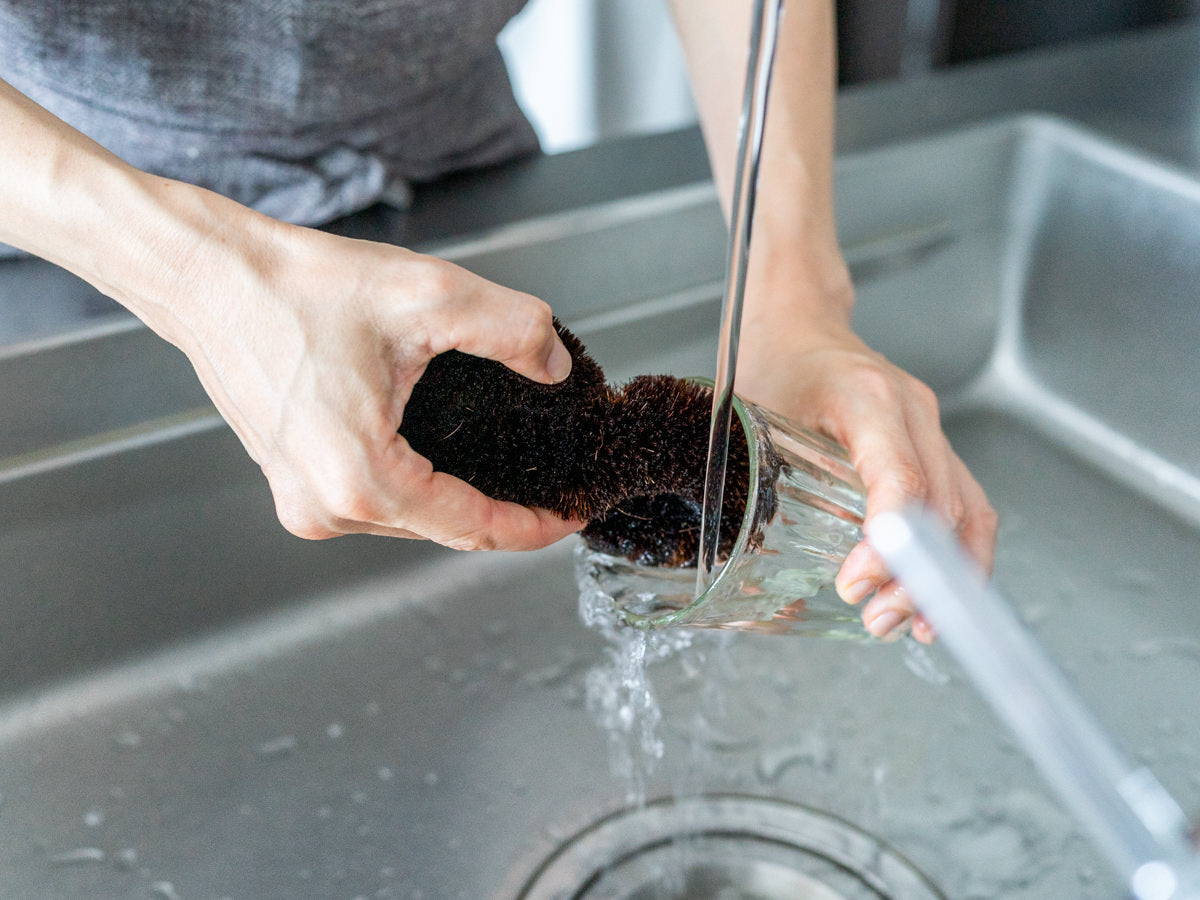 台所でつかい終わったら、たわしにはさまった汚れをとりのぞき、