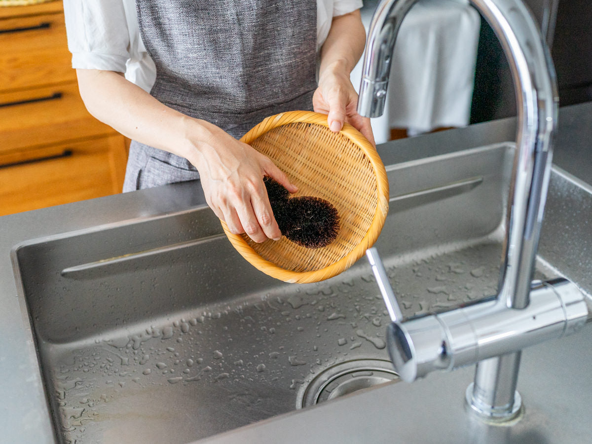 竹ざるはたわしと水で、表と裏の両面をよくこすってください。