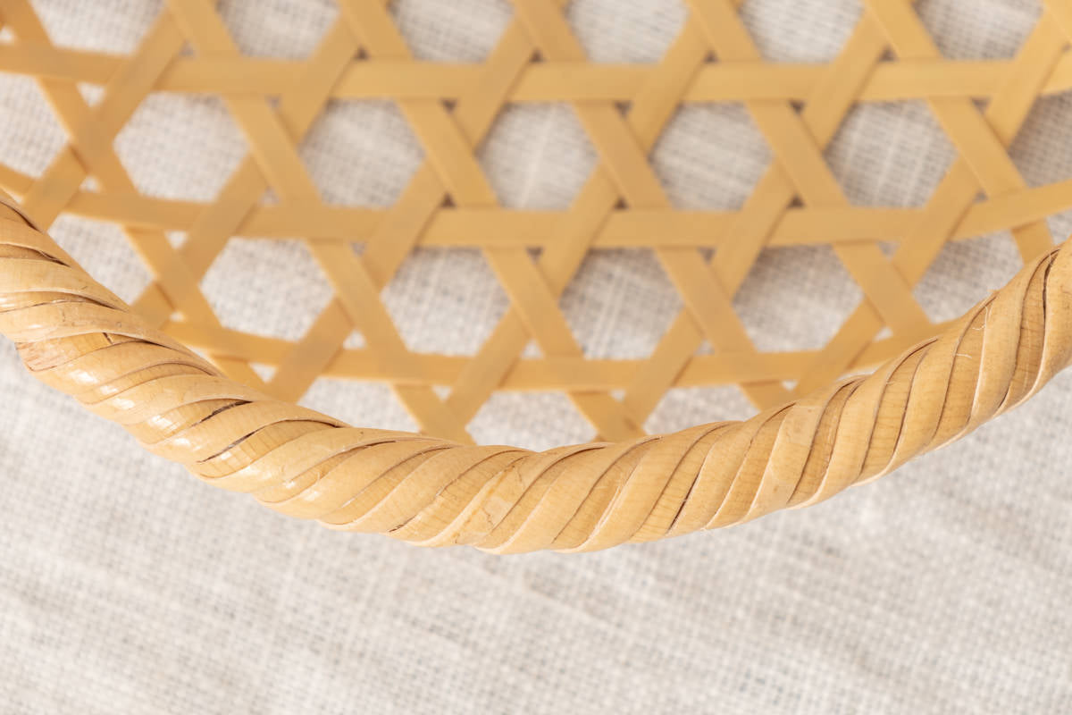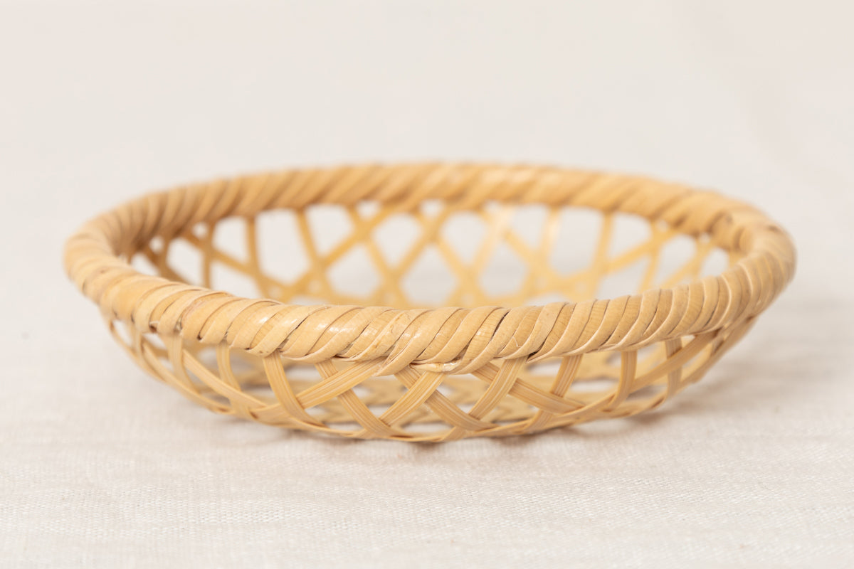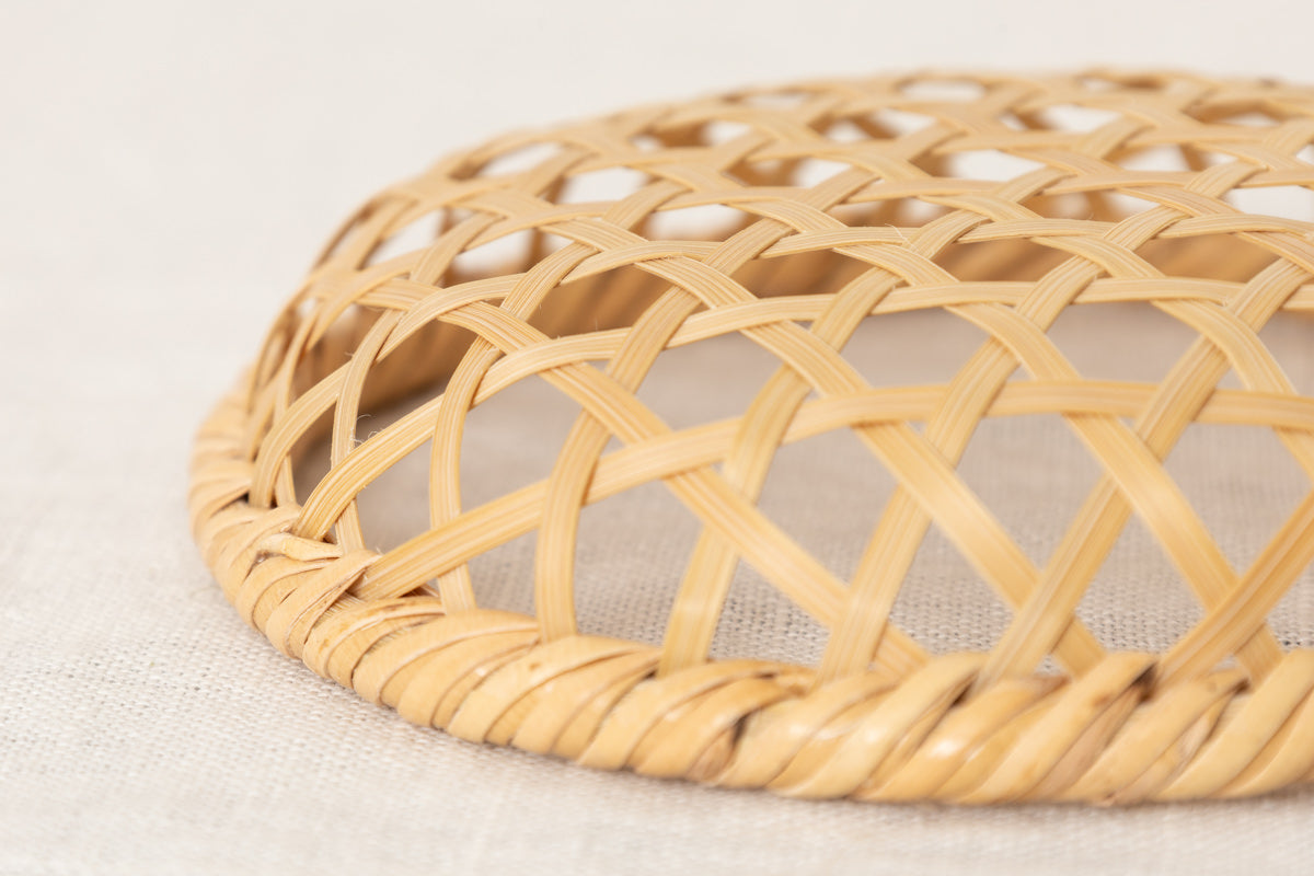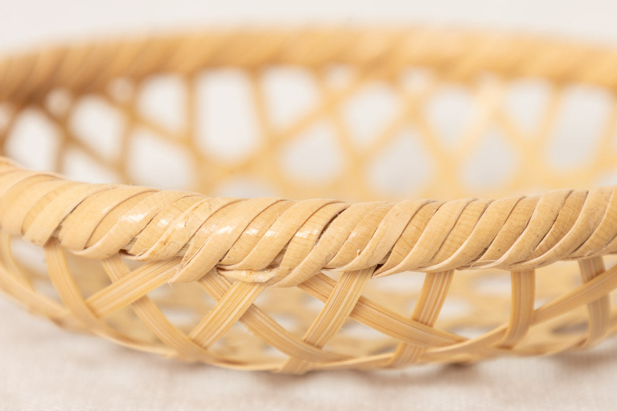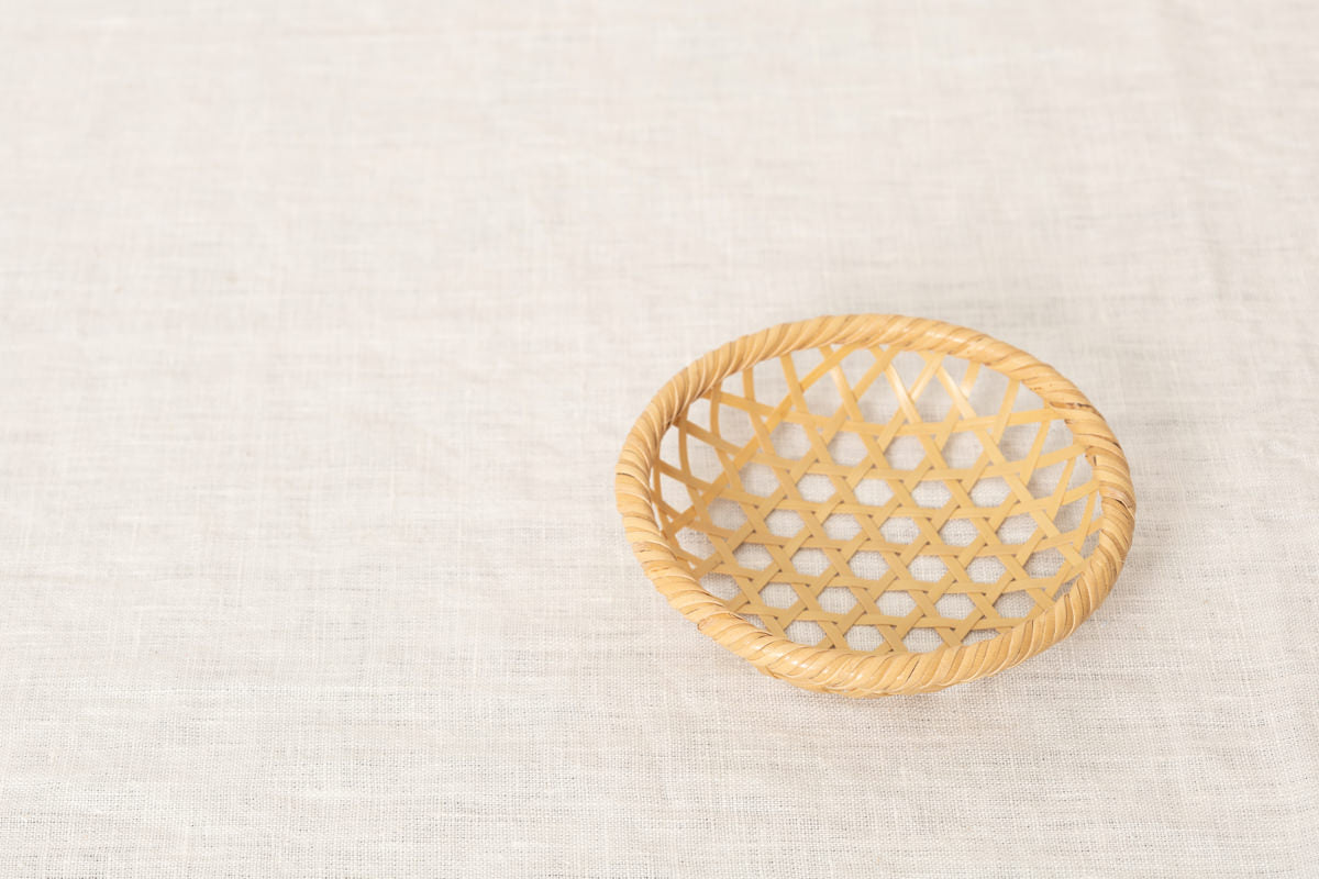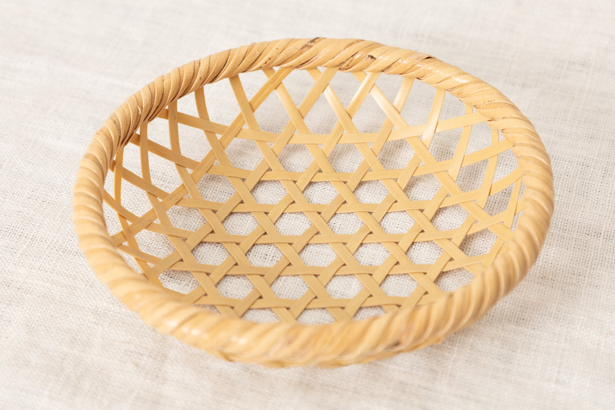 竹の油と色を抜いた「白竹」を使って作られた、小さくて丸いかごです。