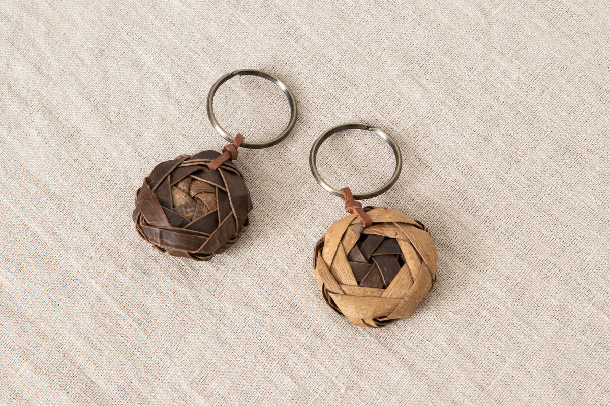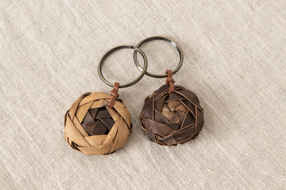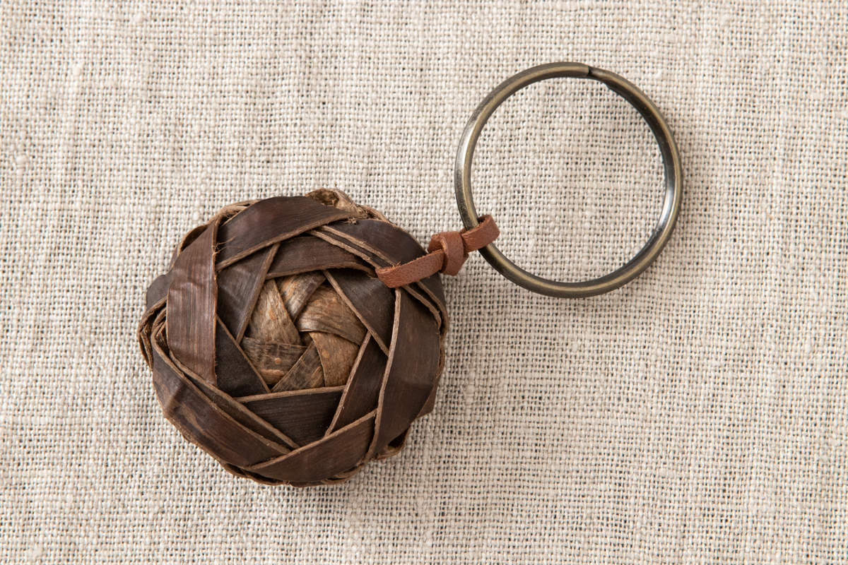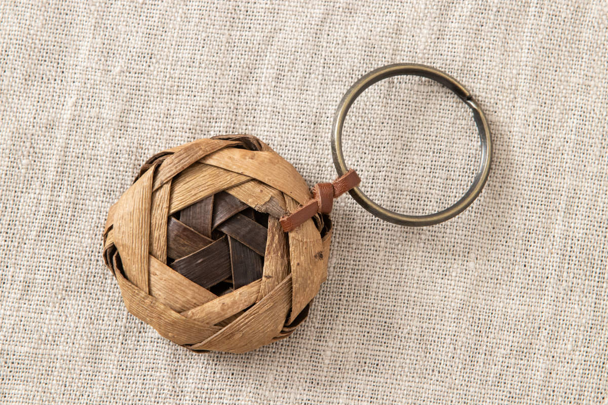 こちらは、くるみの樹皮をバラのような形に編んだキーホルダーです。