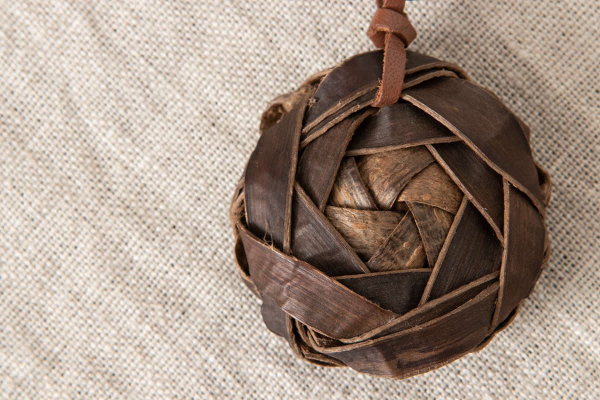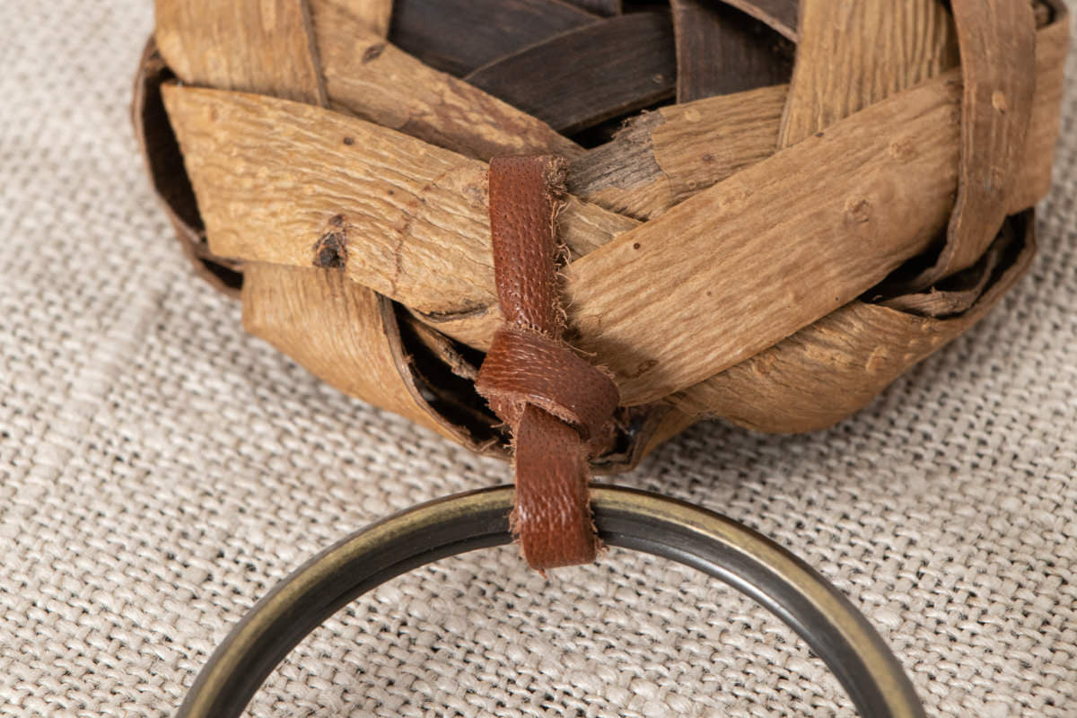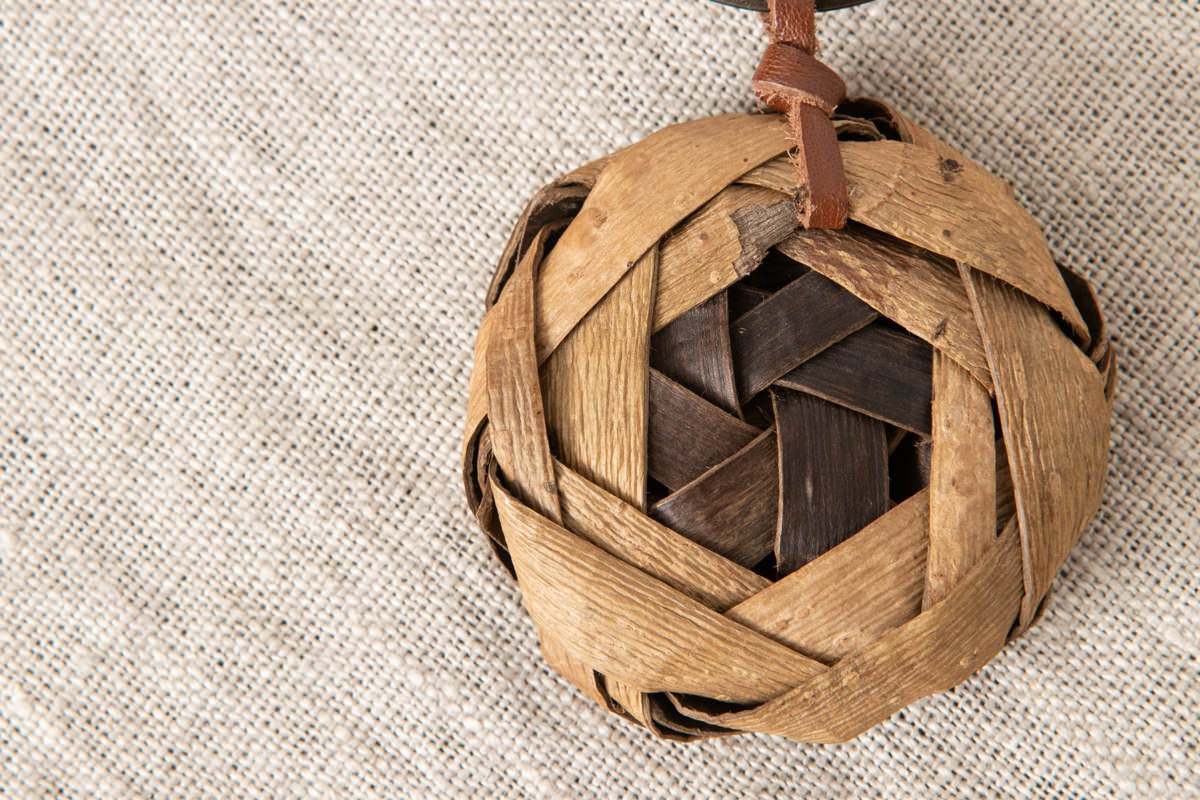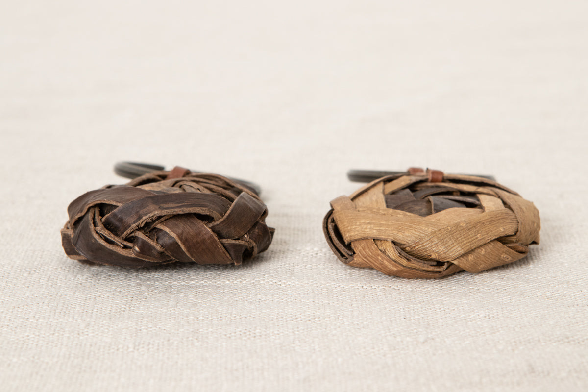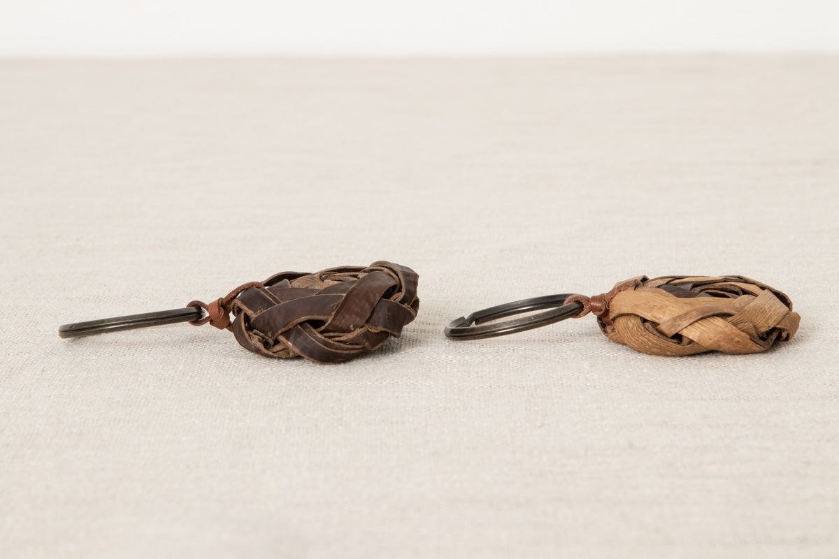 こちらは、くるみの樹皮をバラのような形に編んだキーホルダーです。
