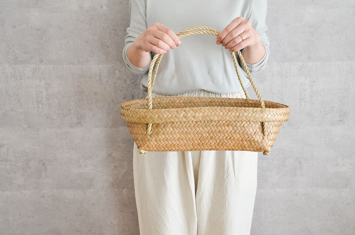 茎の部分を根から切り取り、乾燥させて平たくした状態のものを編み込んでいきます。茎は春(5月ごろ)から夏(8月ごろ)にかけて収穫されます。