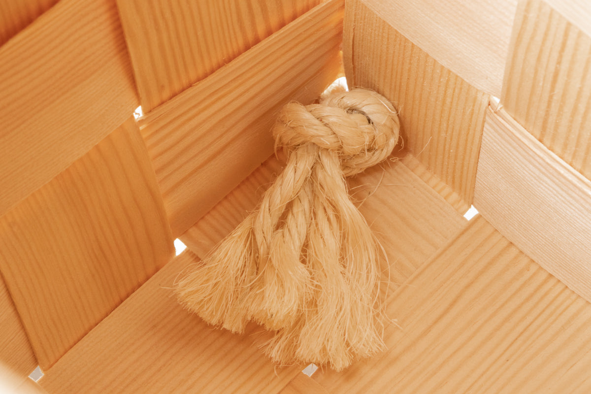 口が開いている上部から見た、内側の隅部分です。太いロープが角の編み目の隙間に通されています。 -
