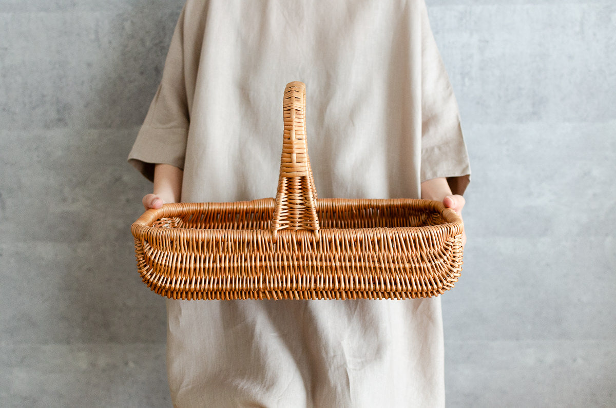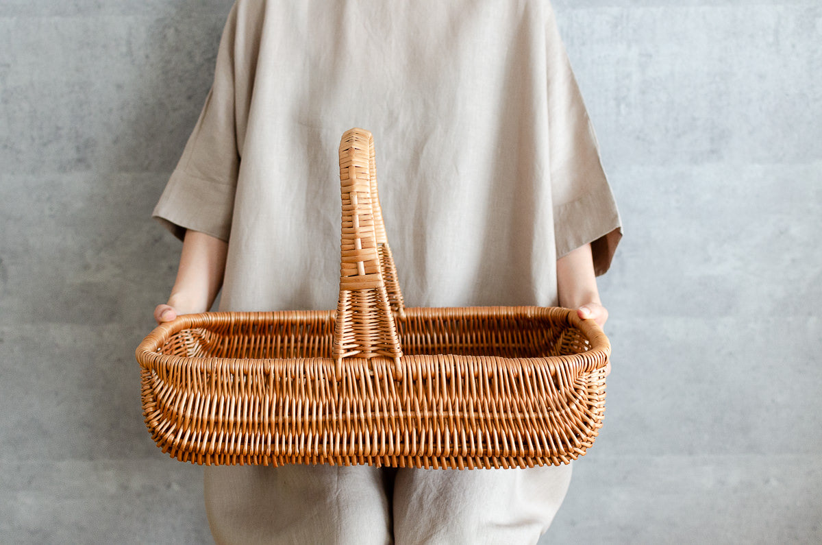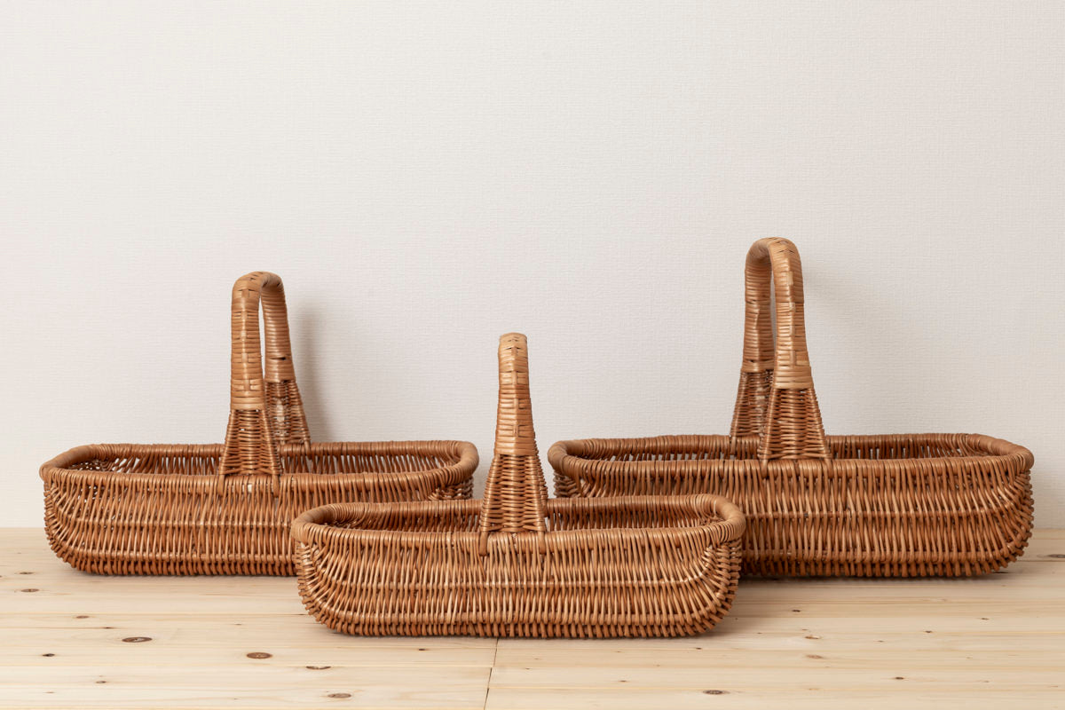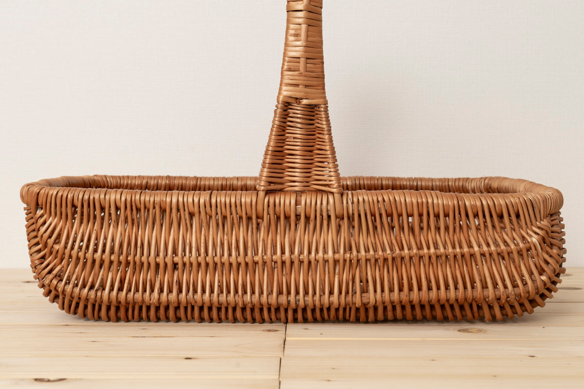こちらは大ぶりで浅くて、横長の形をしたバスケットです。