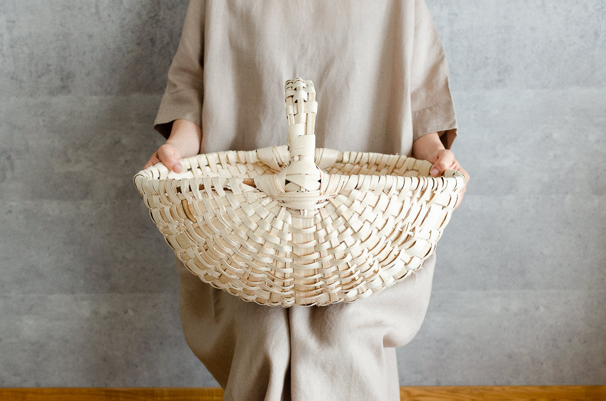 こちらは、ヘーゼル(セイヨウハシバミ)の木から作られた、持ち手がついた楕円型のバスケットです。