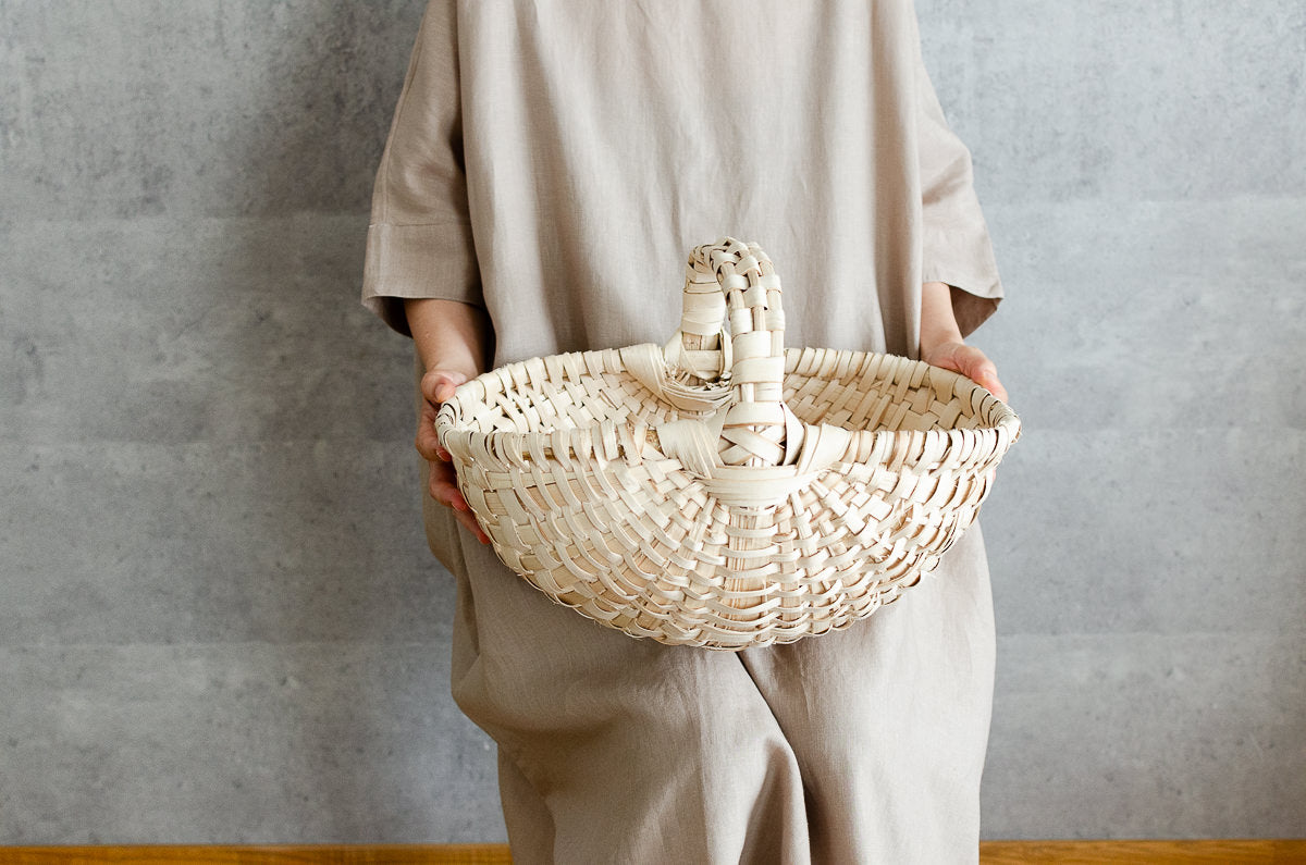 屋内でも屋外でも、さまざまな場面が思い浮かぶ持ち手付きバスケットです。
