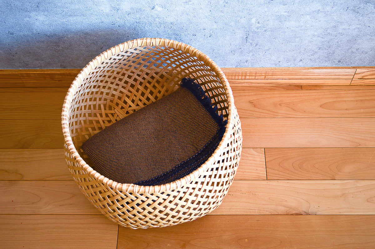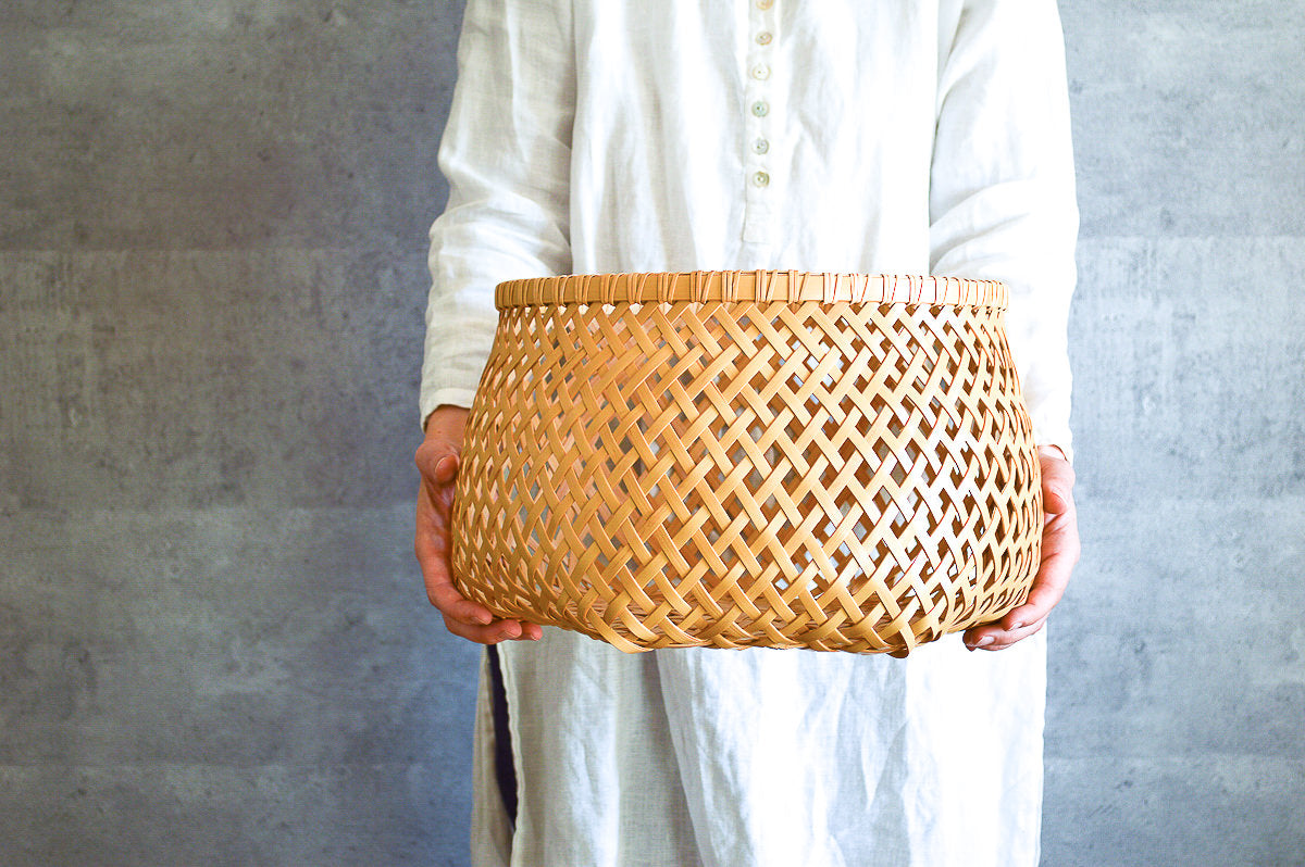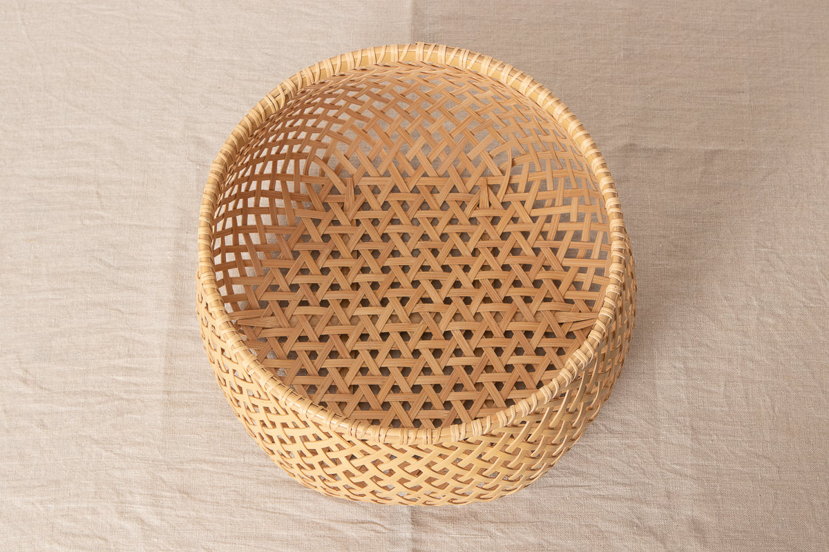 こちらは白竹を使って編まれた丸い、深型のかごです。