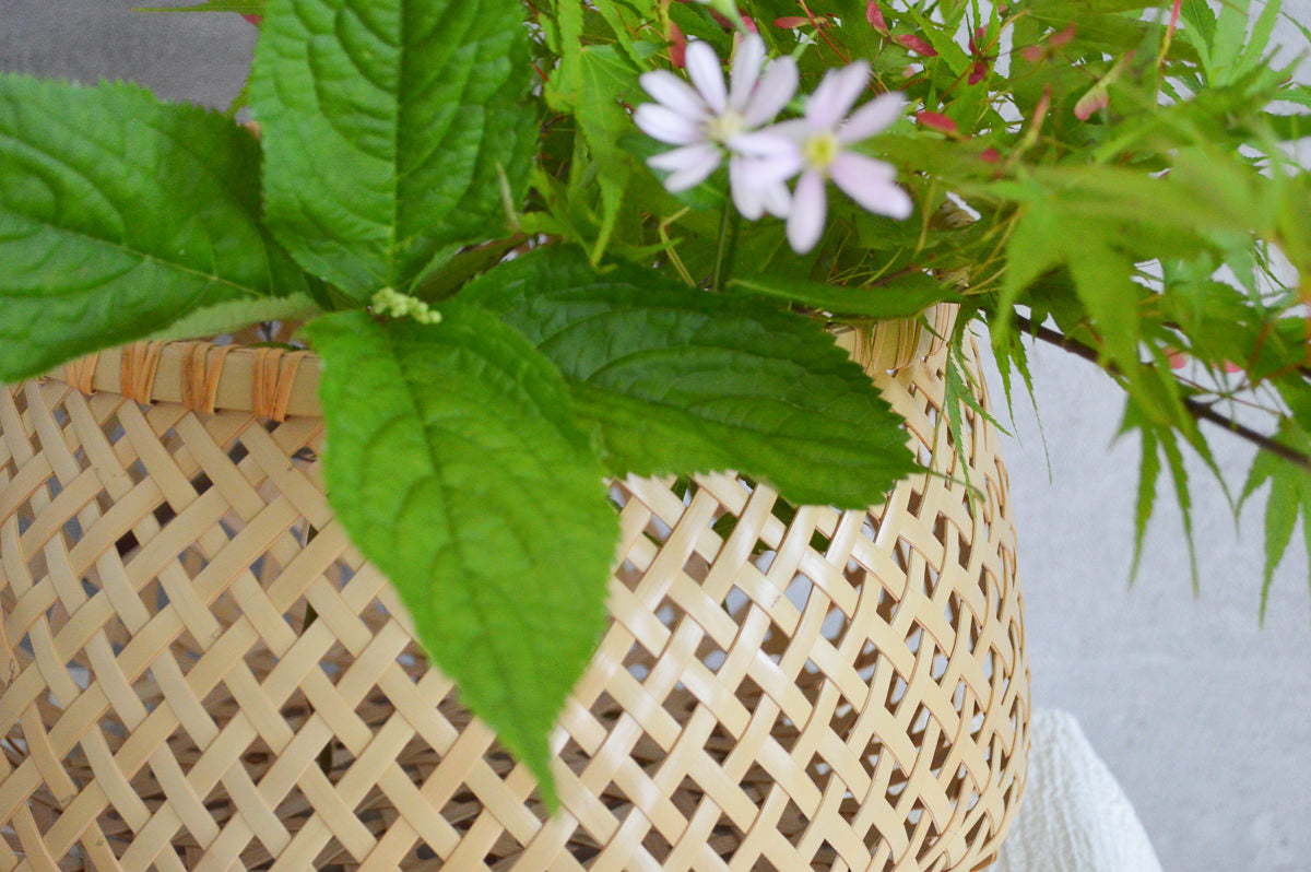 ポテっとした形が愛らしく、白竹が放つ光沢が美しいこちらのかごは