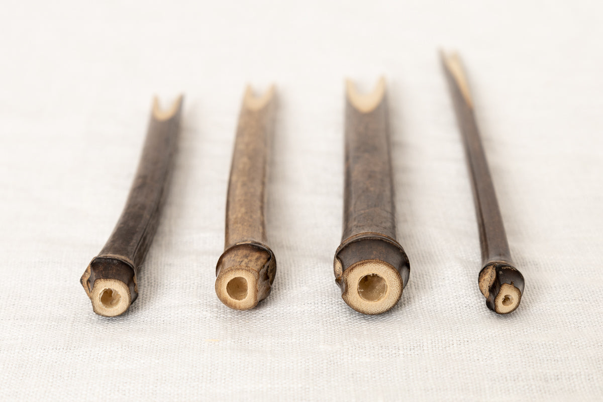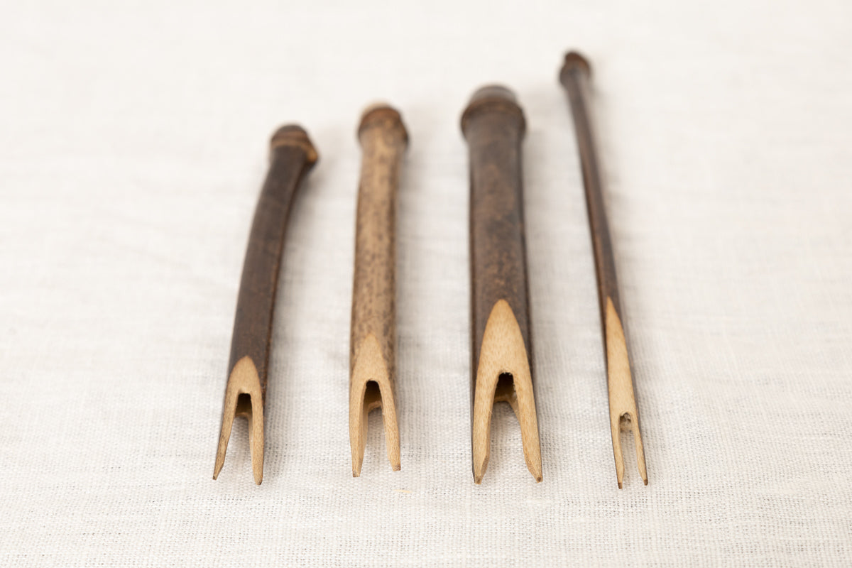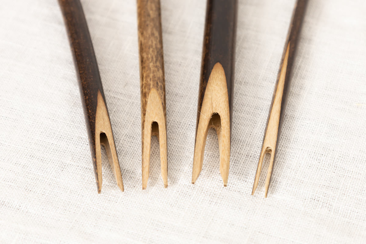 フォークの先端ですが、竹の皮が削られ、身の部分が見えます。