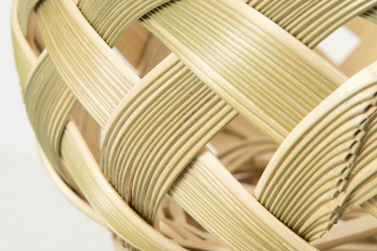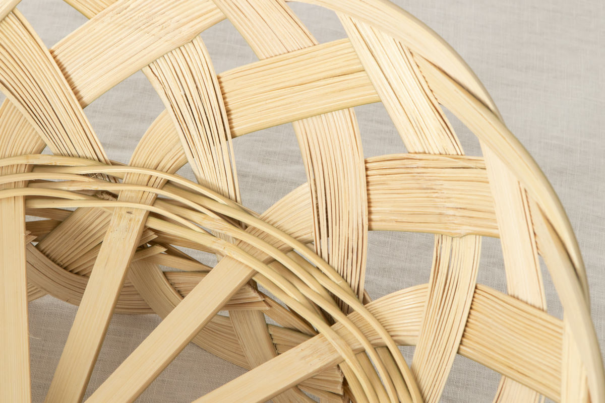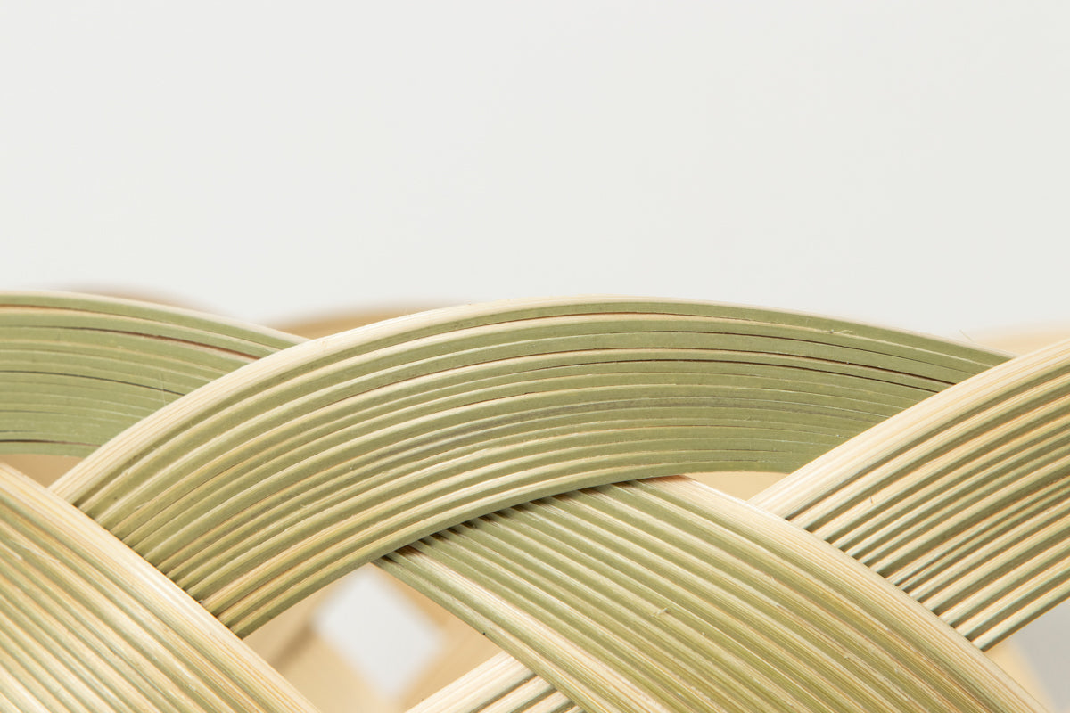 針金も籐(とう)も使わずに、ただ竹のみを編み込んで留めています。ささら状のひごが光を受けて光沢を放っています。 -
