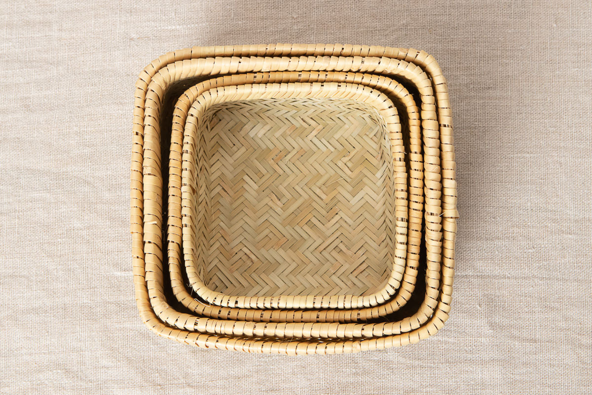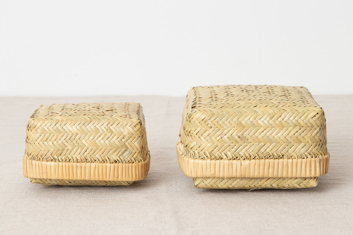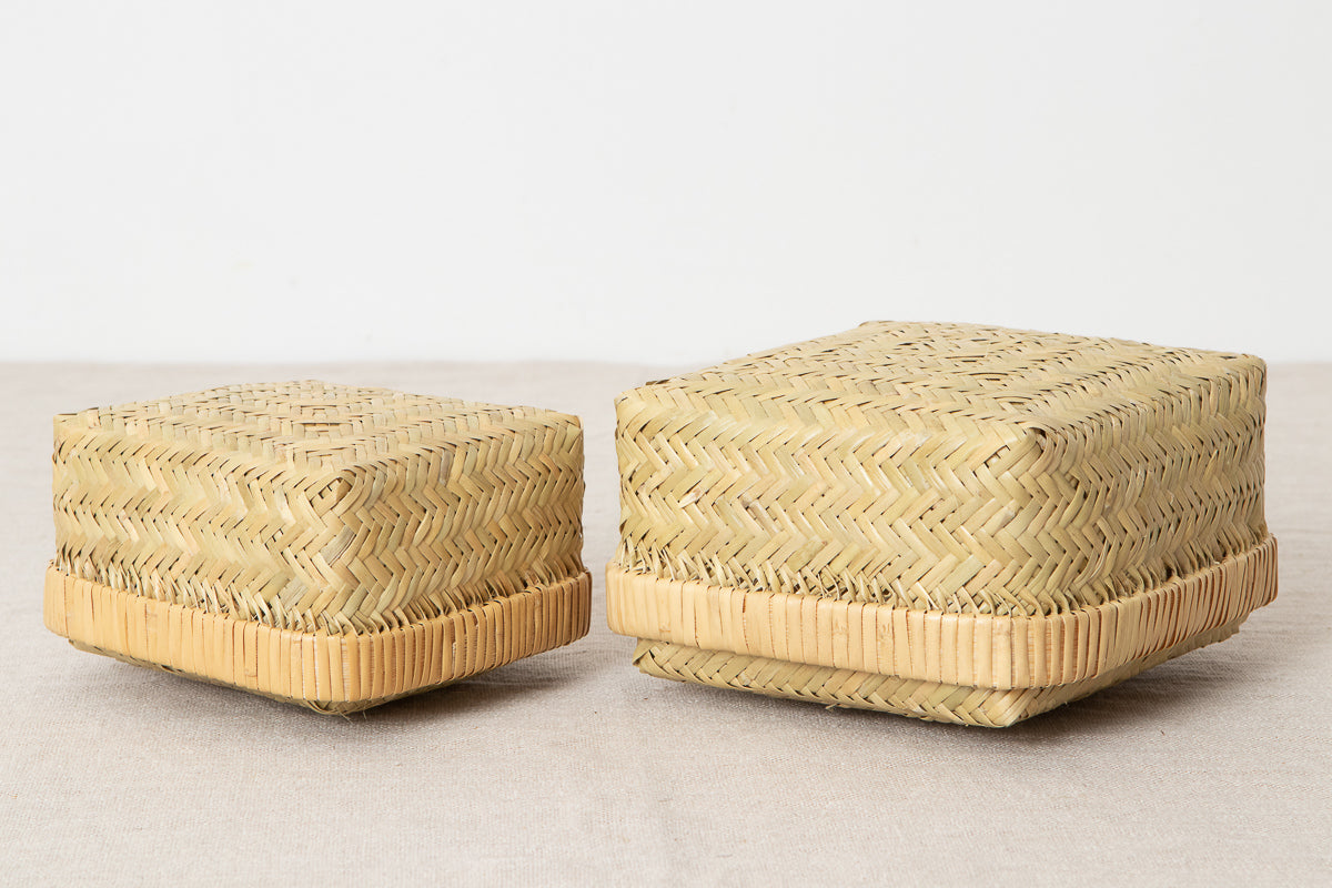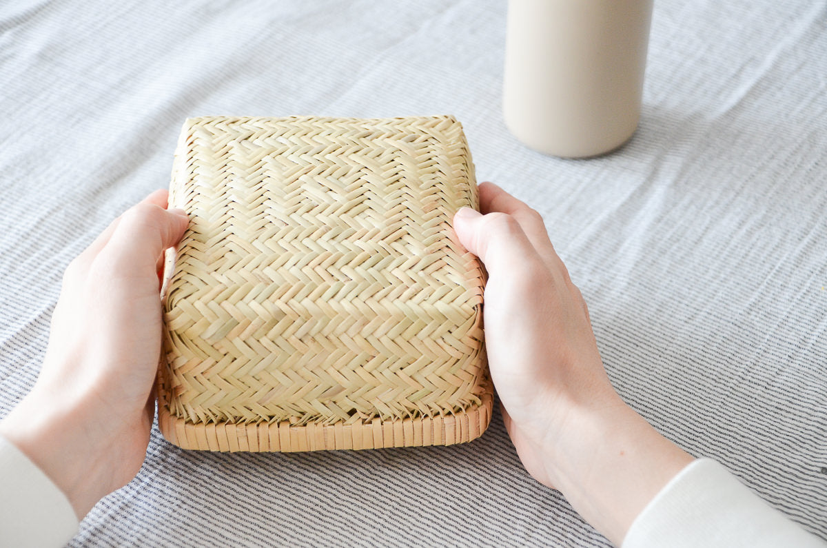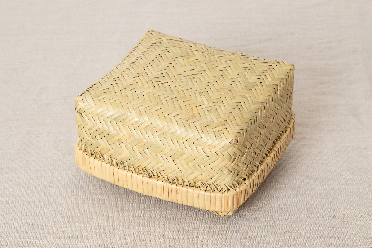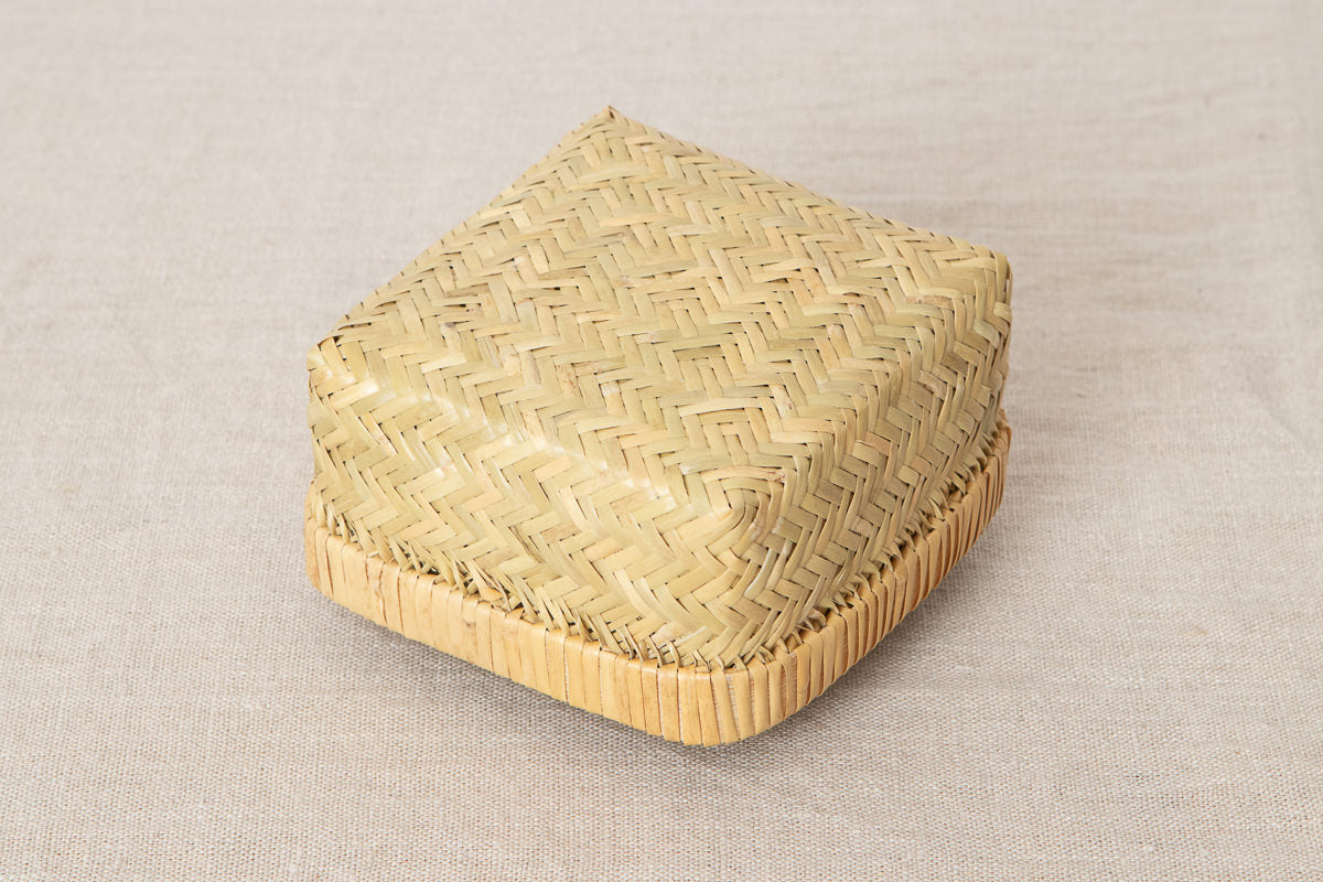 伝統的な「あじろ編み」という編み方で作られたこの地域の蓋付きかご、