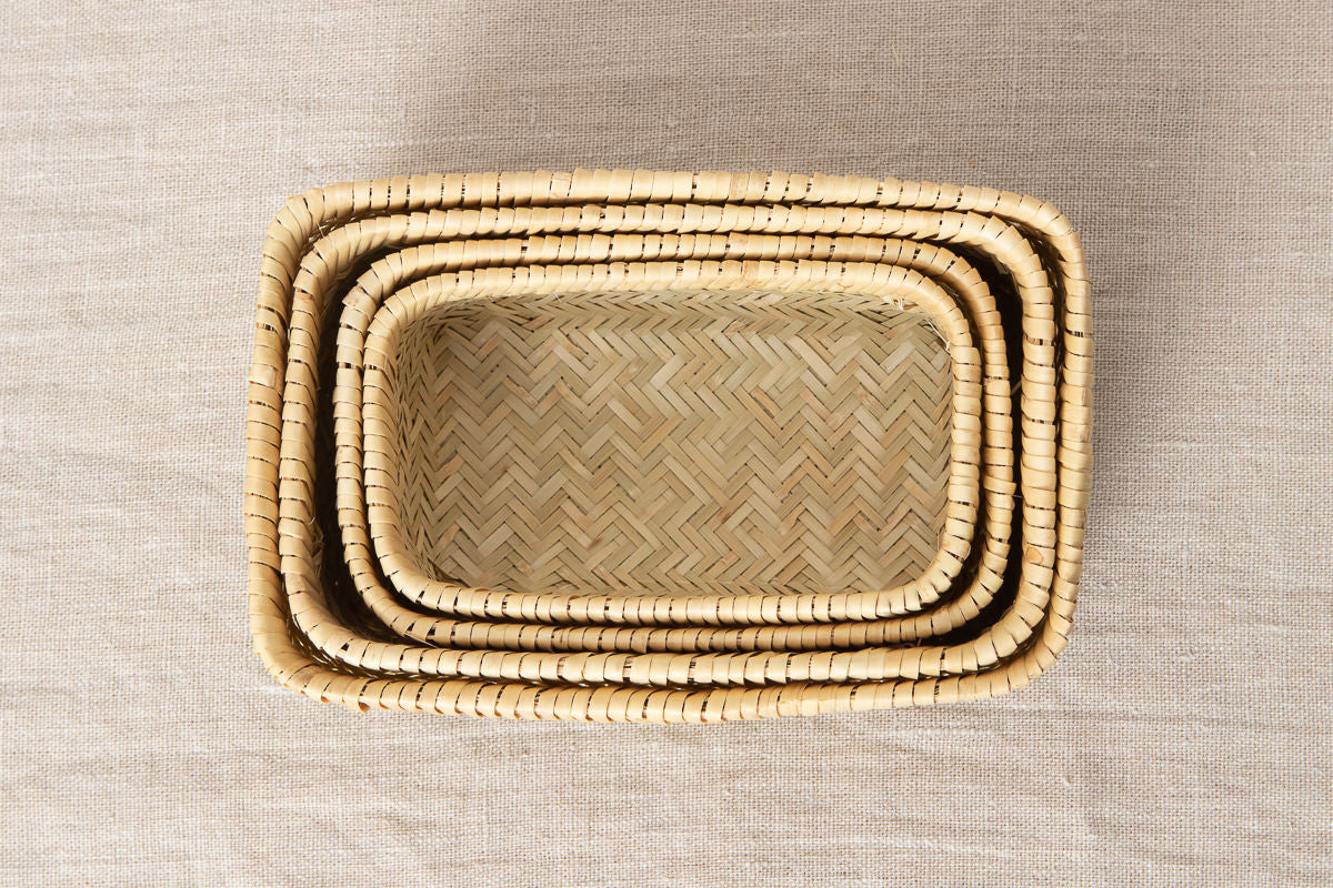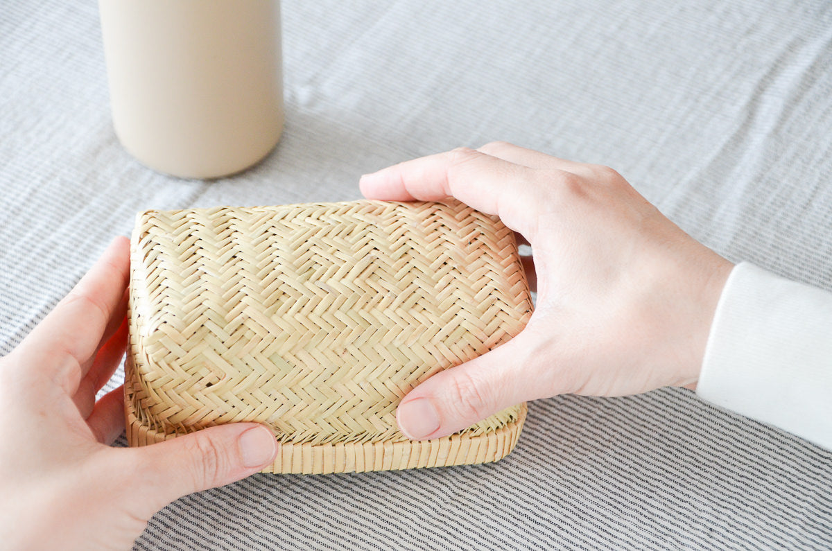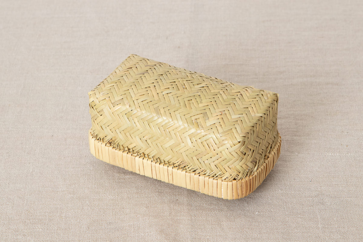 伝統的な「あじろ編み」という編み方で作られたこの地域の蓋付きかご、