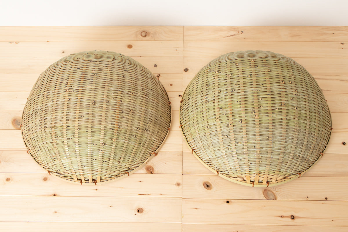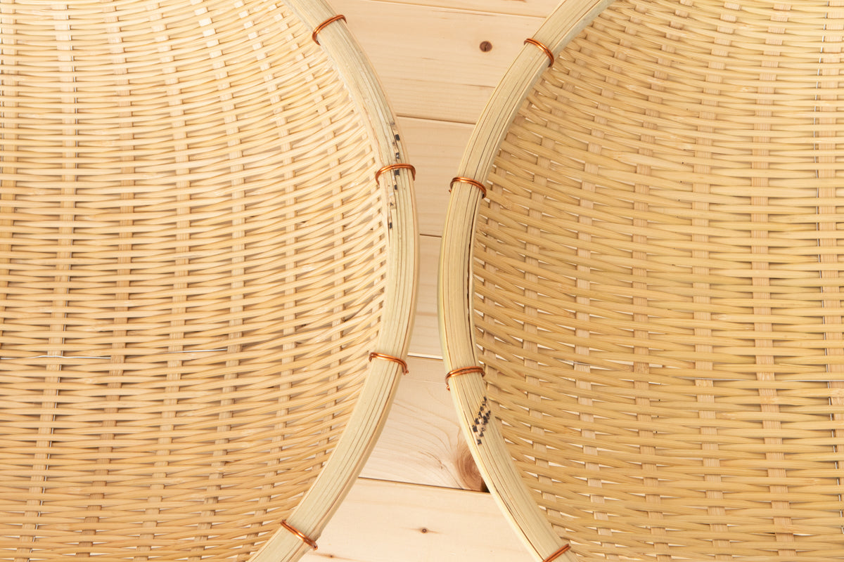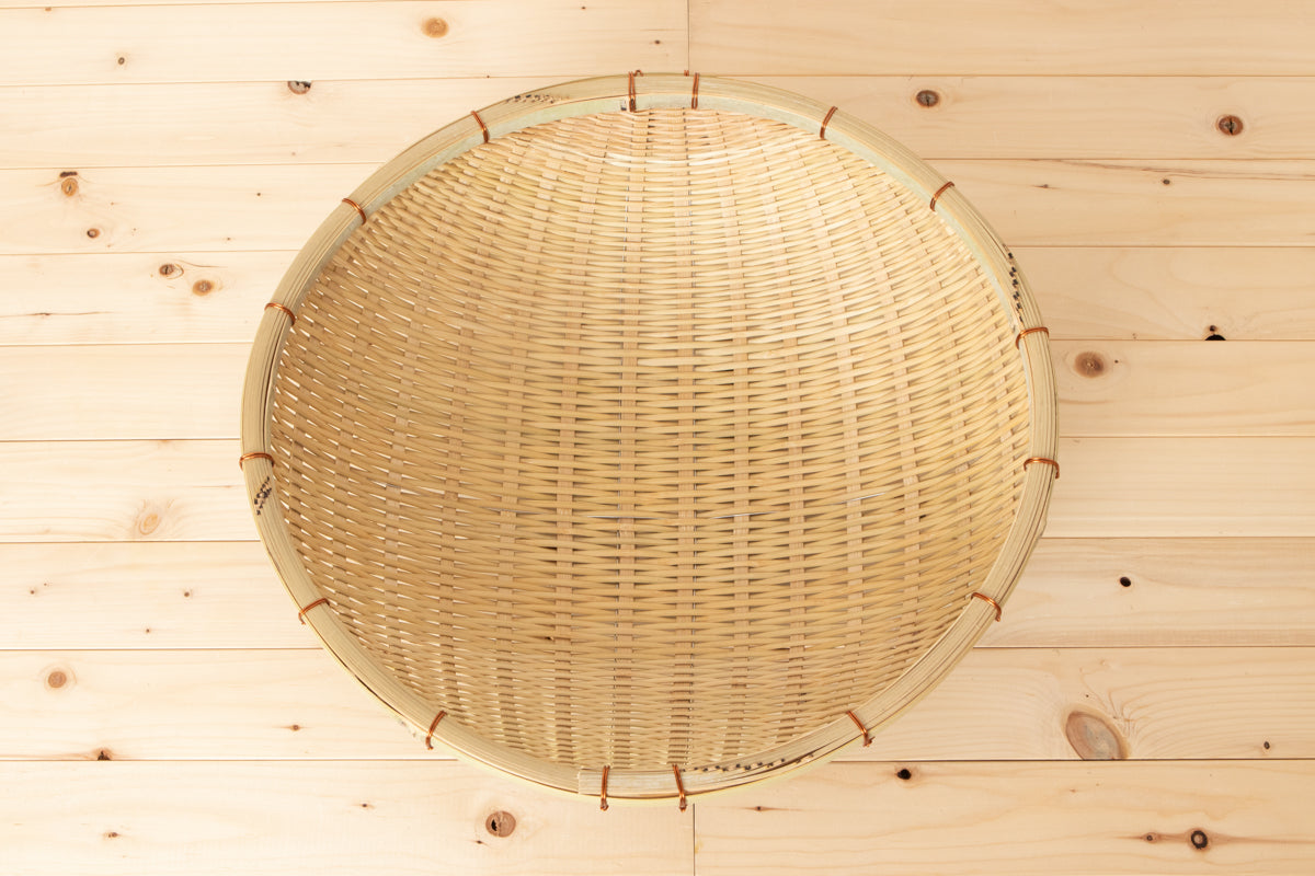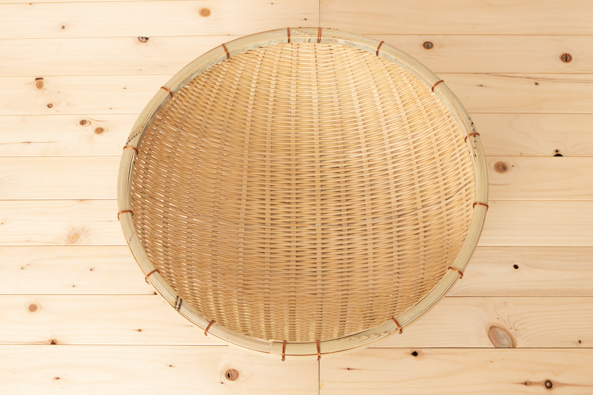 機械を使わず、一本一本のひごをナタと手で仕立て、がっちりと編み上げられたざるは、力強く、それでいて美しい。