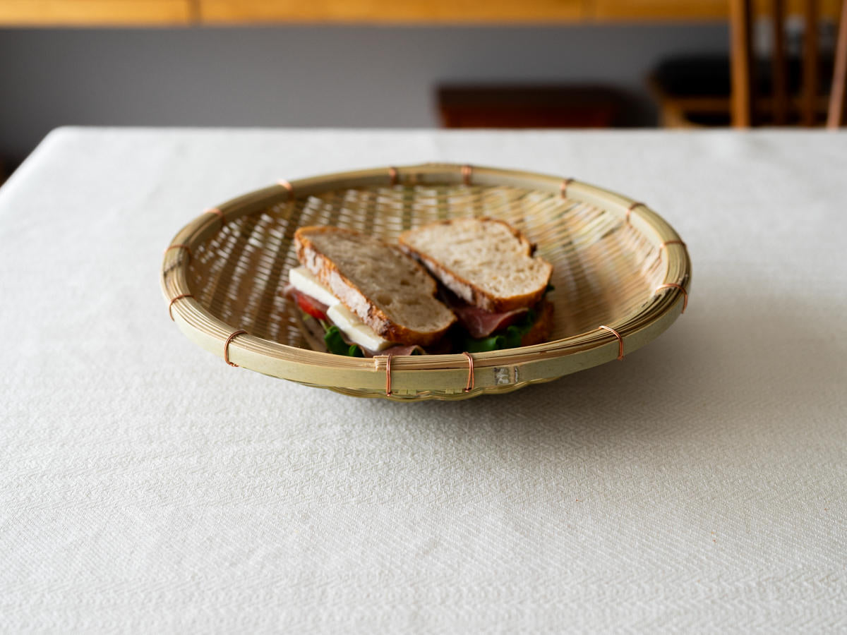 テーブルに置いて、パンやおにぎり、麺類などを載せてお皿のように使える浅めの竹製丸ざるです。