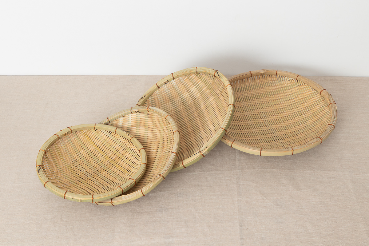 機械を使わず、一本一本のひごをナタと手で仕立て、がっちりと編み上げられたざるは、力強く、それでいて美しい。
