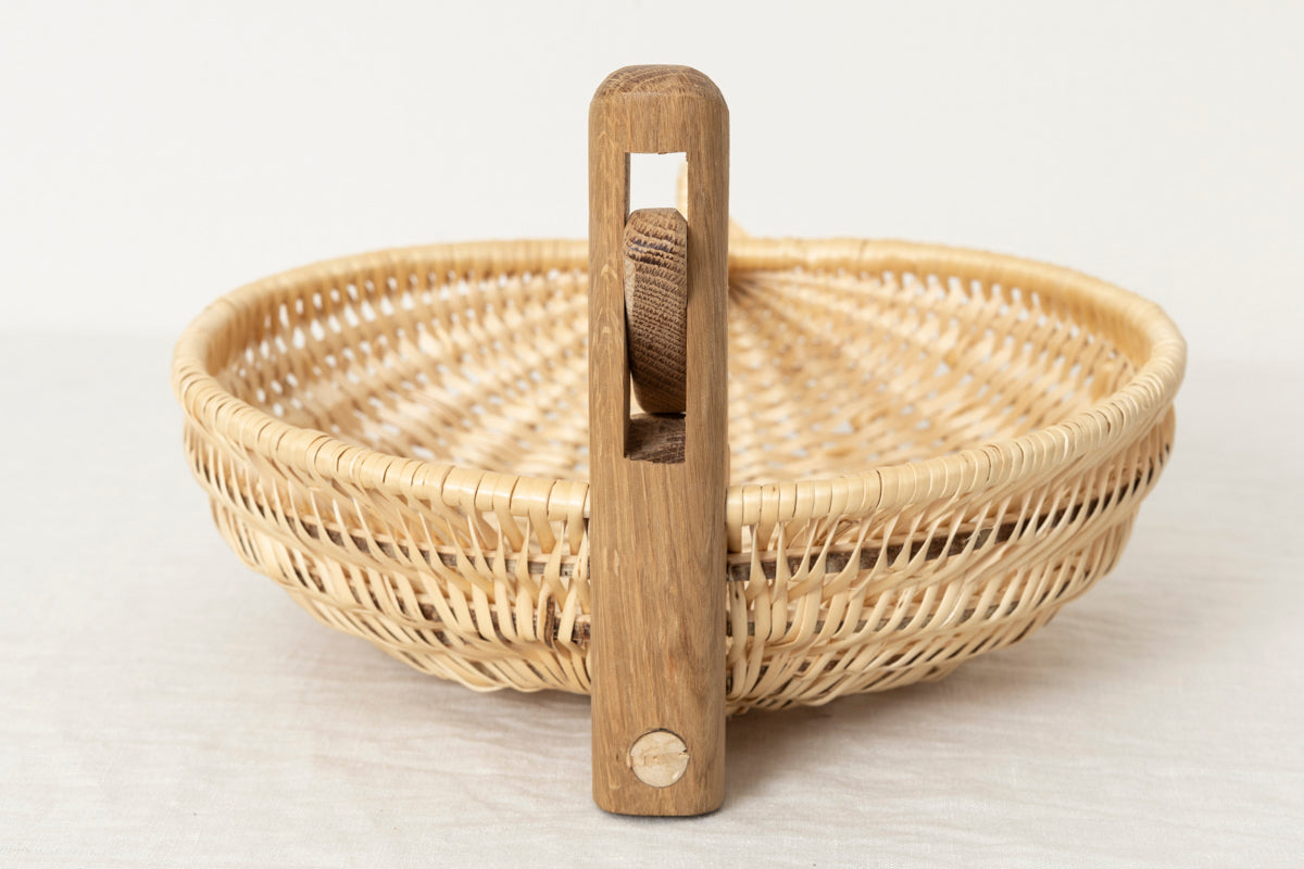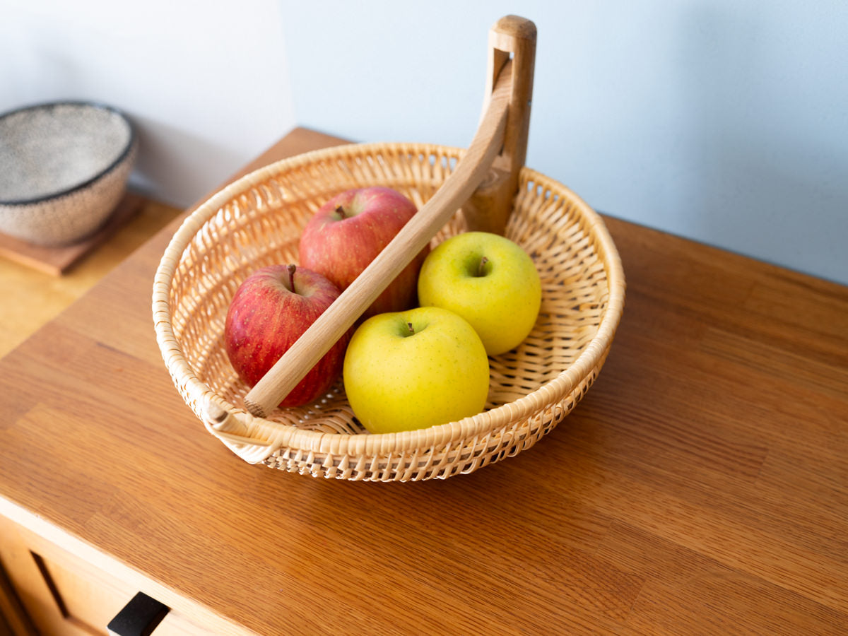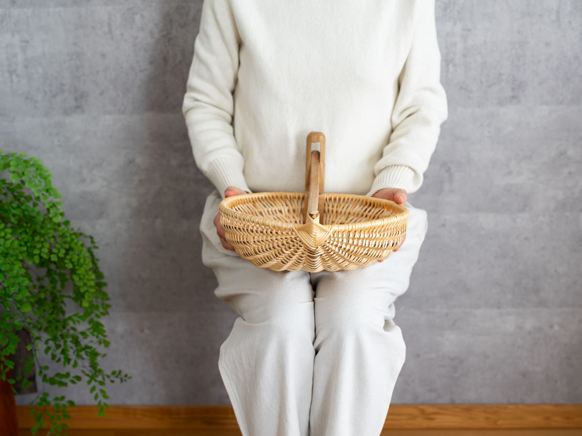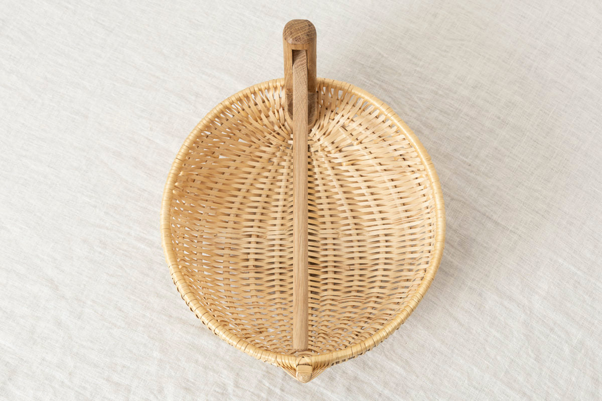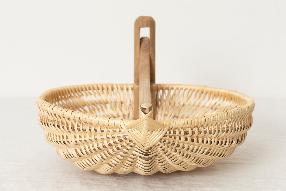 こちらは動く持ち手がついていて、ほかでは見たことのないようなかごです。
