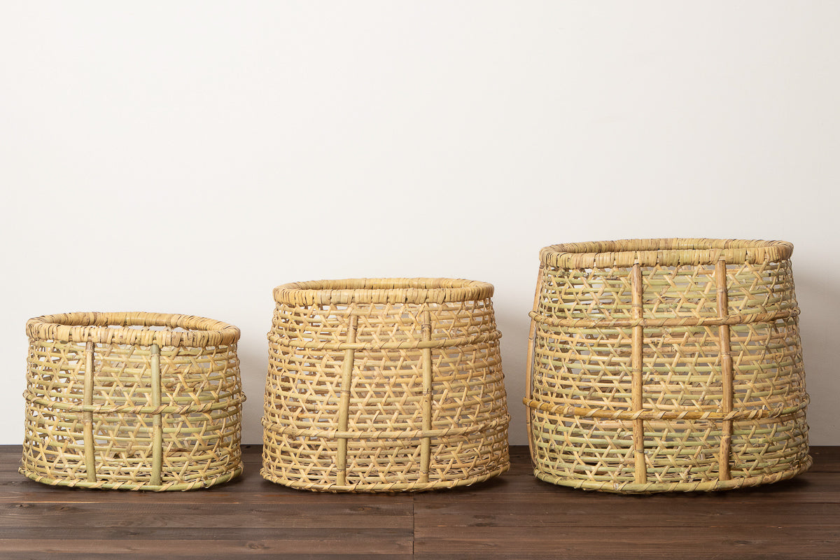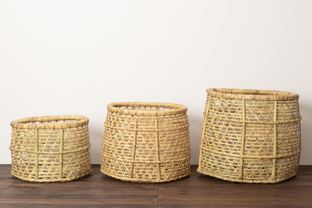 自然の野趣が感じられる、滋味深い雰囲気の根曲竹細工。