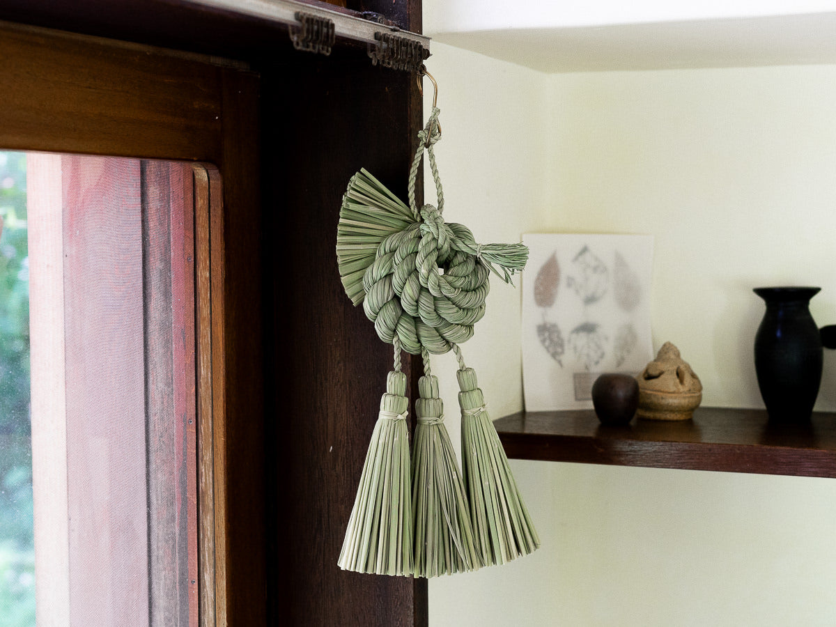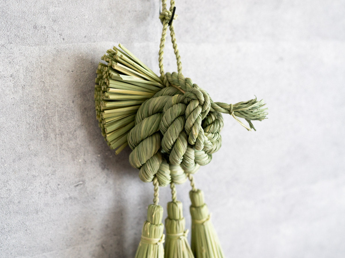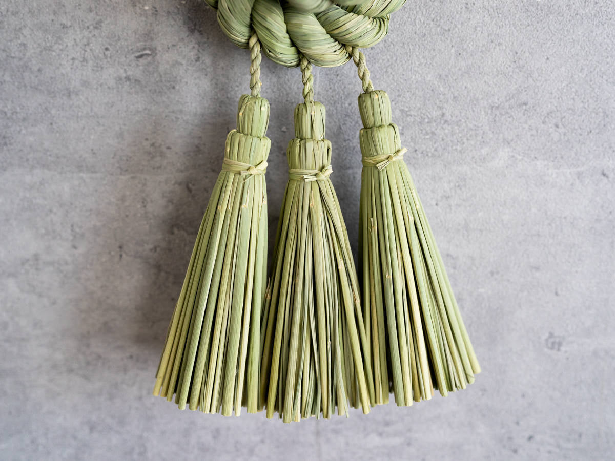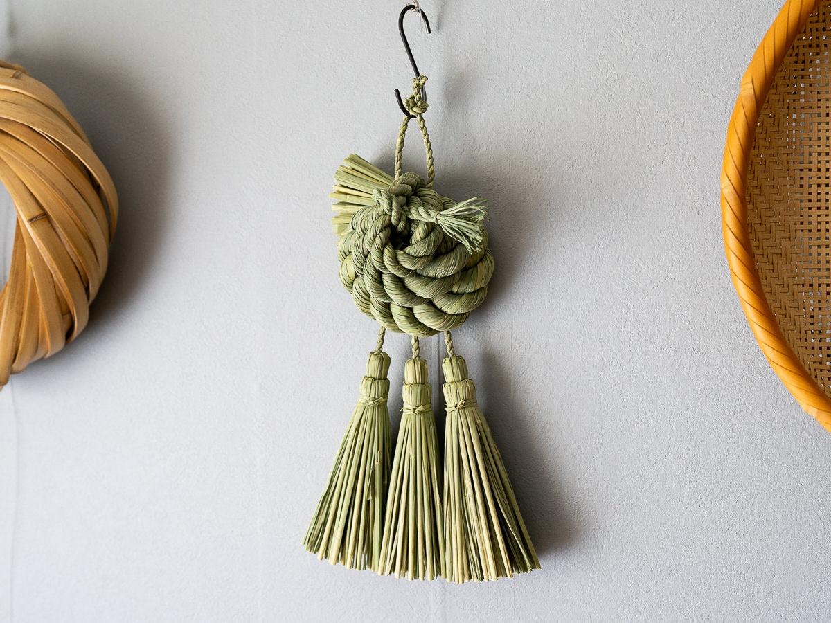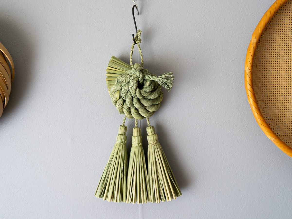 しめ縄が三連の輪になったかたちと、三つのタッセルのようなかざりが印象的です。