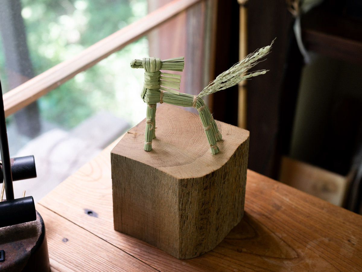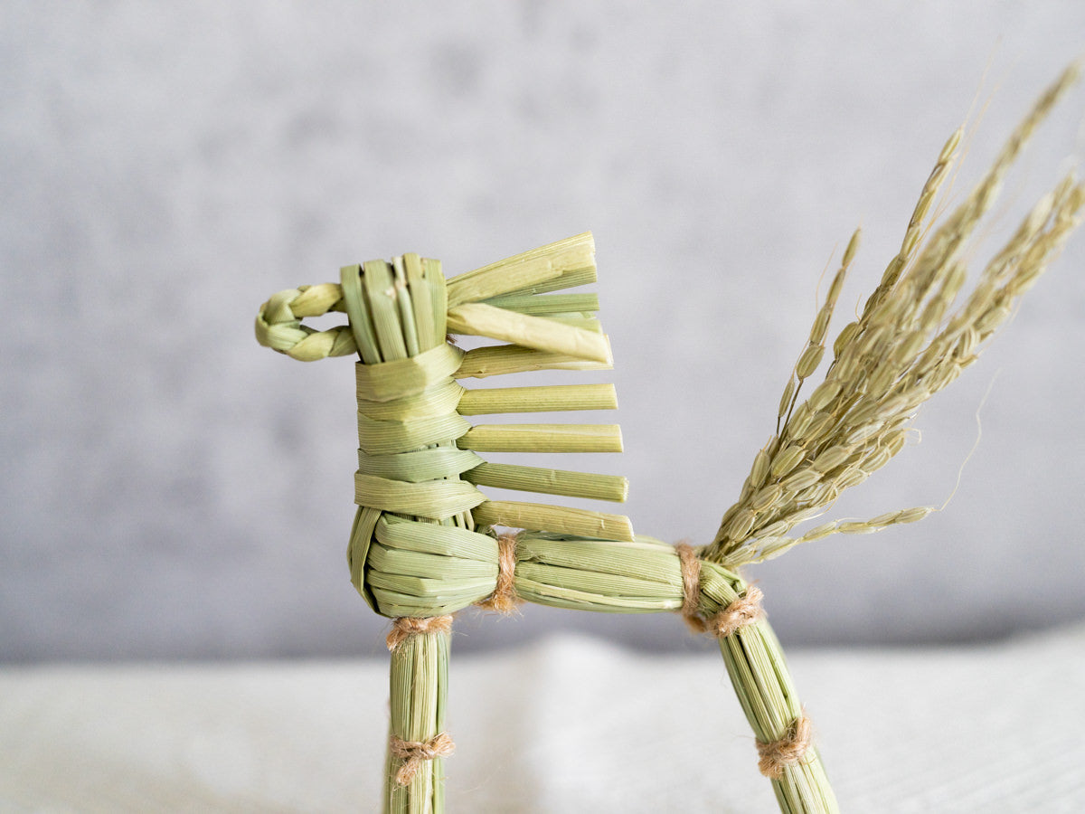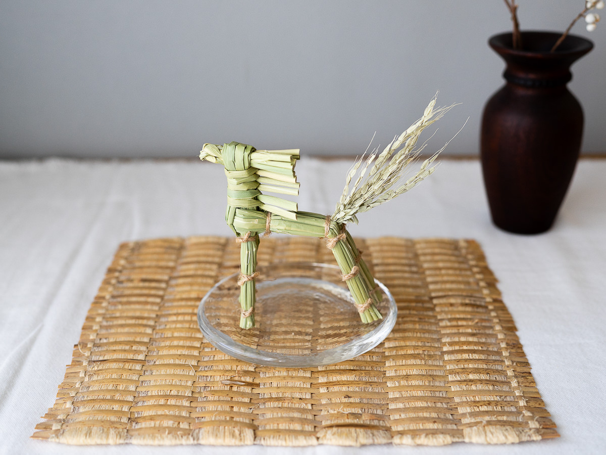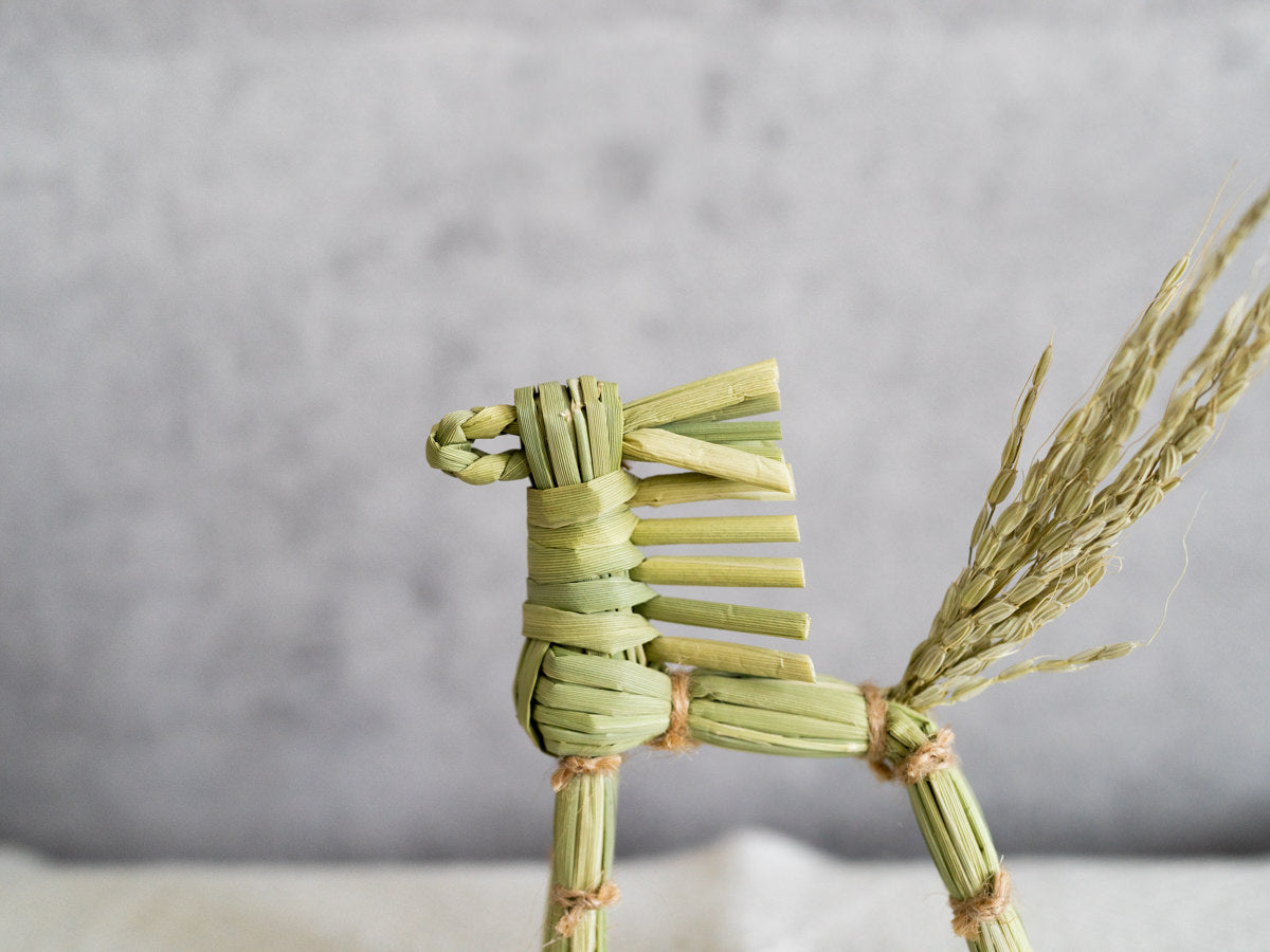 わらを束ねてかたどった馬の姿に、稲穂の尾を添えて仕立てたしめかざり。