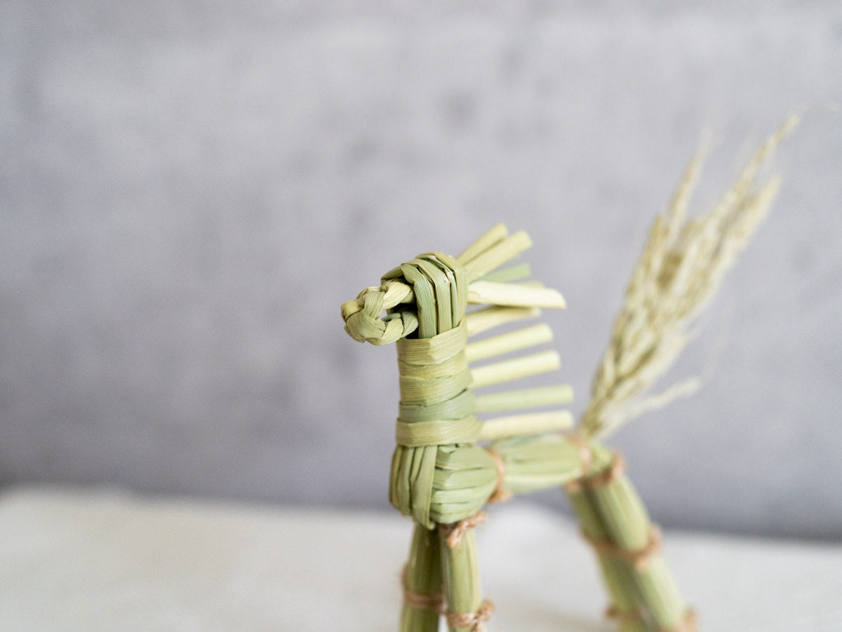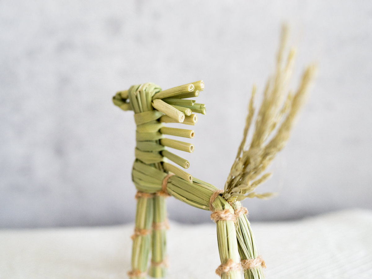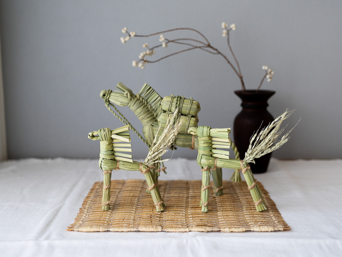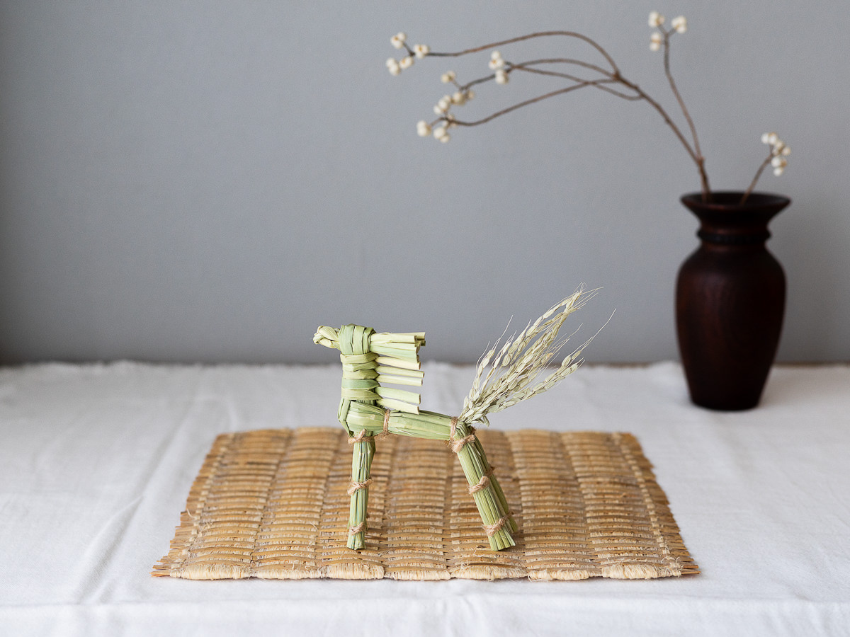 わらを束ねてかたどった馬の姿に、稲穂の尾を添えて仕立てたしめかざり。