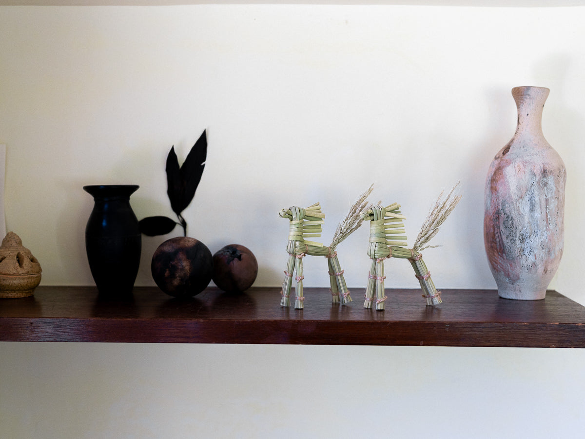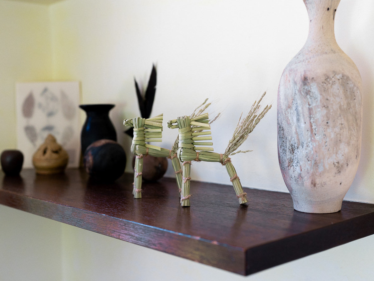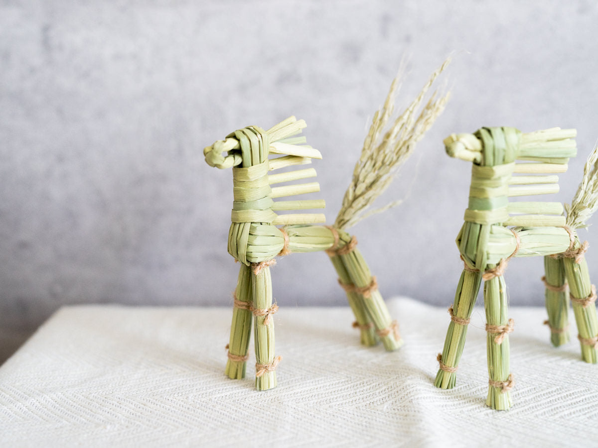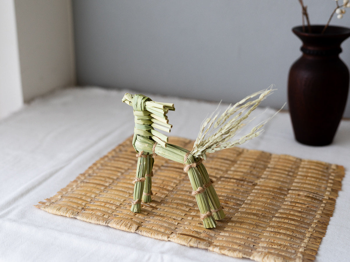わらを束ねてかたどった馬の姿に、稲穂の尾を添えて仕立てたしめかざり。