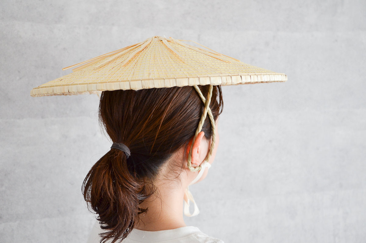 軽くて風通しよく、涼しいと使われている菅笠は、水や雪もはじいてくれます。