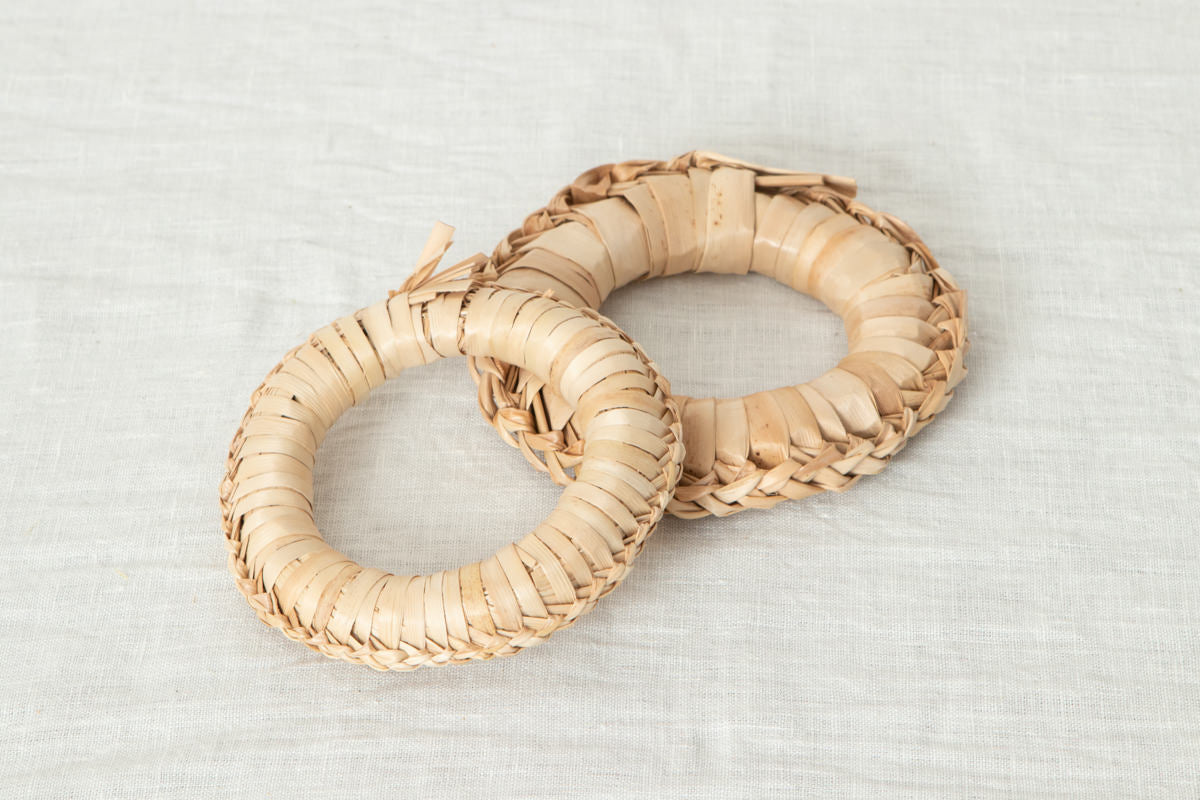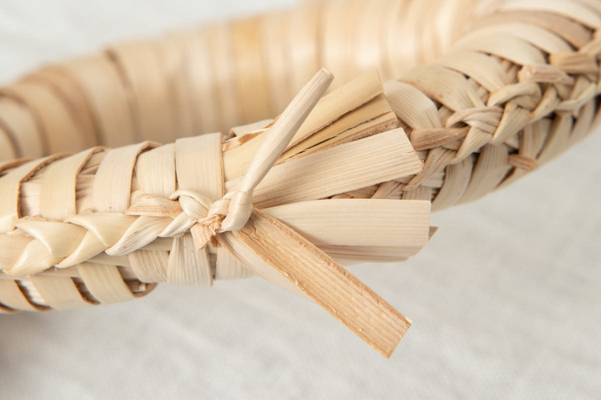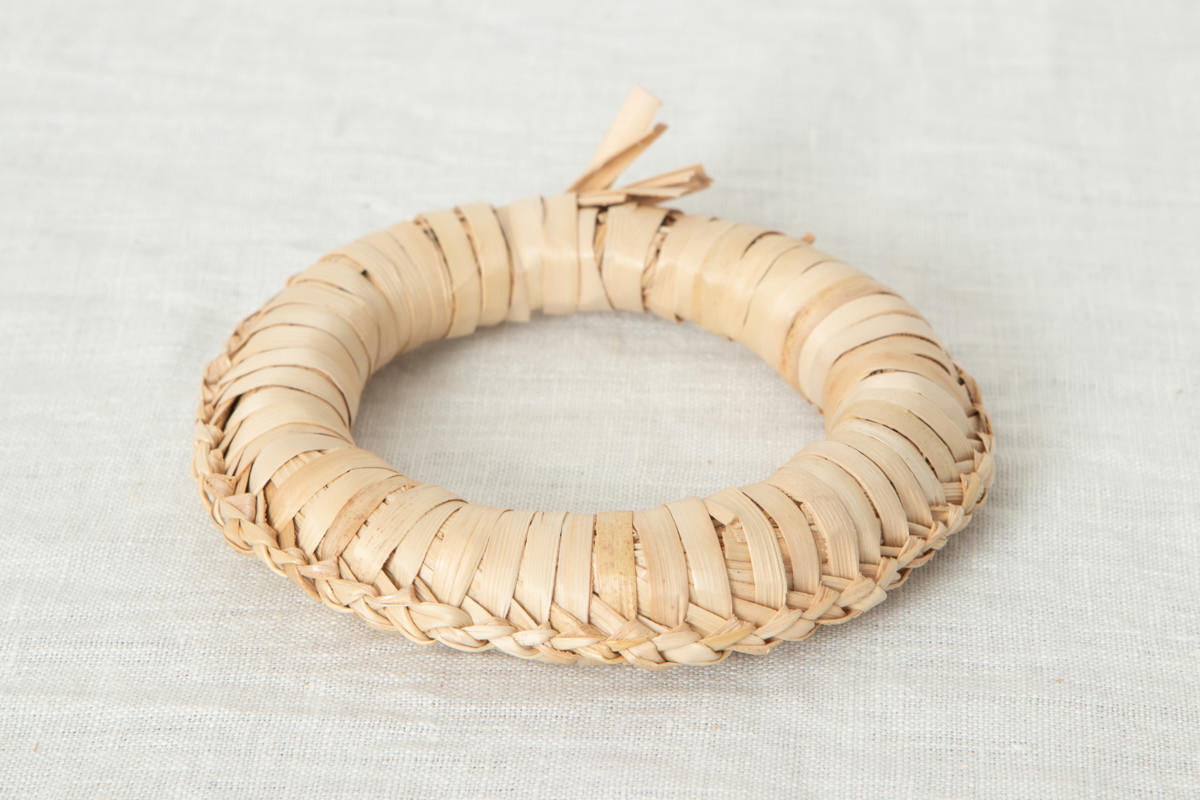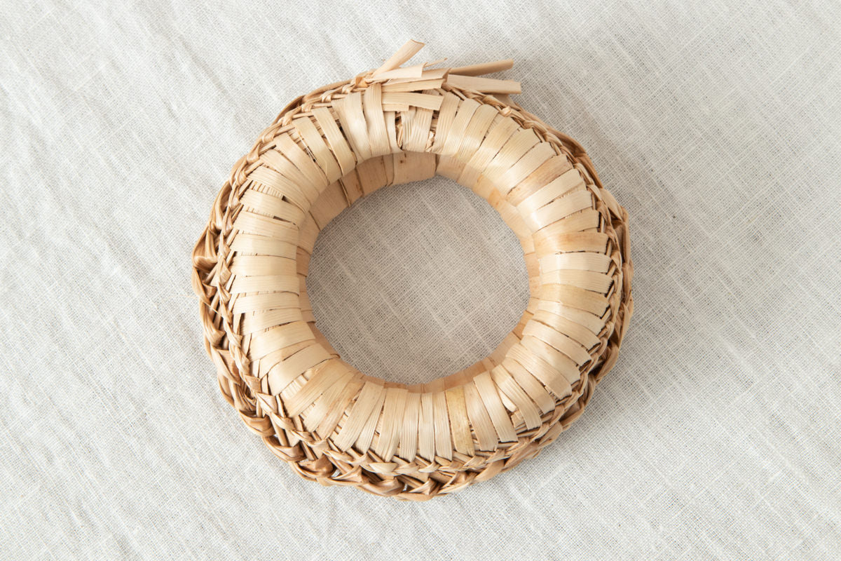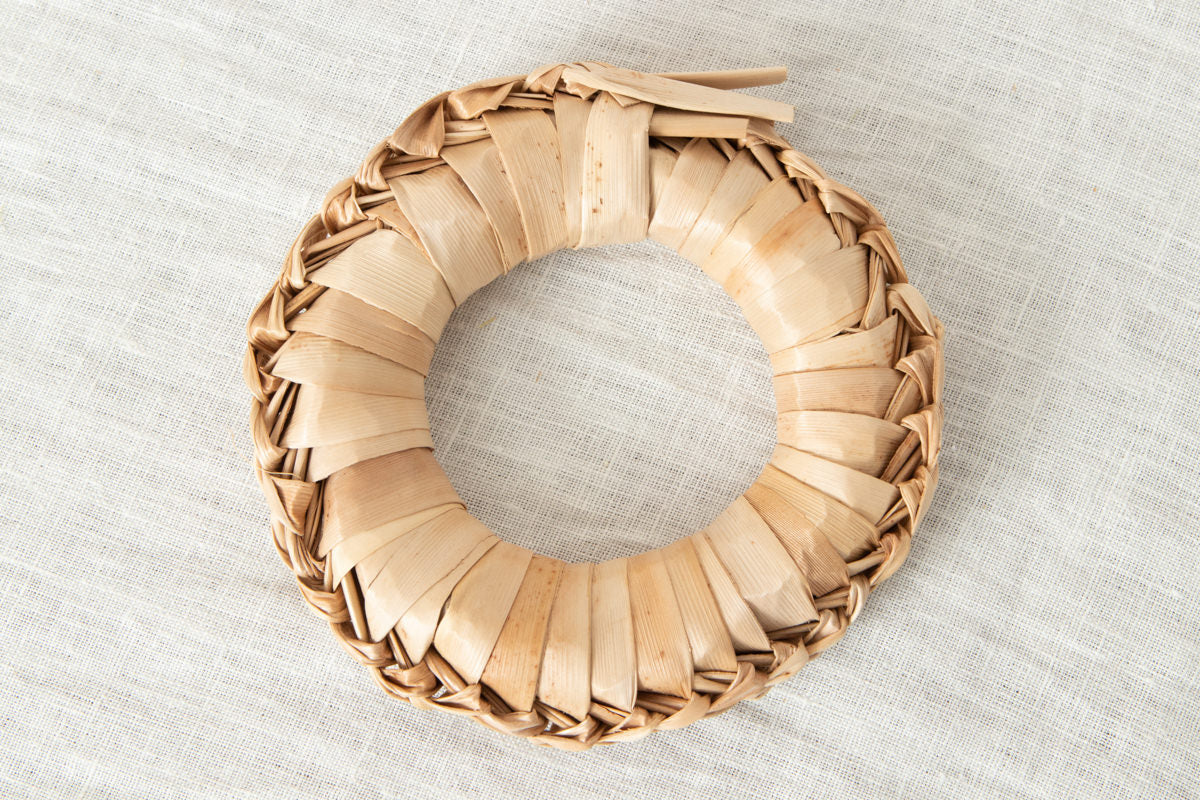 その芯を同じく幅広に割いた月桃の葉で縛りながら作っていきます。 -